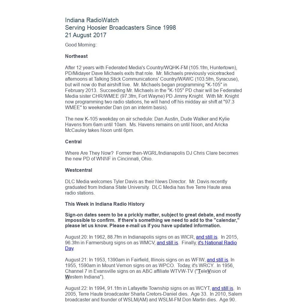 August 22: In 1994, 91.1fm in Lafayette Township signs on as WCYT, and still is. In 2005, Terre Haute broadcaster Sharla Cretors-Daniel dies. Age 33. In 2010, Salem broadcaster and founder of WSLM(AM) and WSLM-FM Don Martin dies. Age 90.
