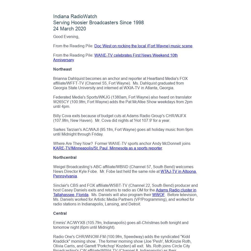 Indiana RadioWatch subscriptions are free. To subscribe, send an e-mail to irw@well.com and we'll add you. After publication, we archive Indiana RadioWatch on the Indiana Radio Archive at indianaradio.net. Please e-mail us your news stories and employment opportunities.