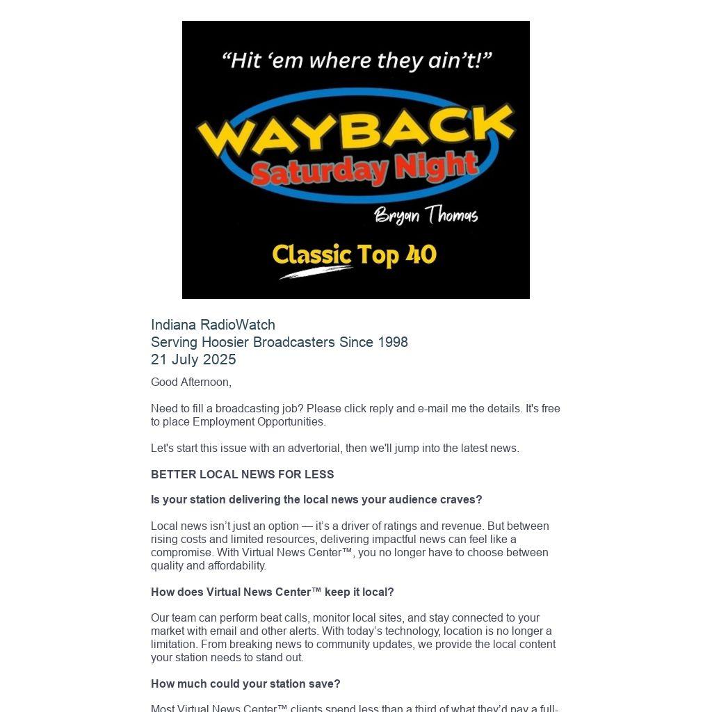 IndianaRadioWatch subscriptions are free. To subscribe, send an e-mail to irw@well.comand we'll add you. After publication, we archive Indiana RadioWatch on theIndiana Radio Archive at indianaradio.net. Please e-mail us your news storiesand employment opportunities.