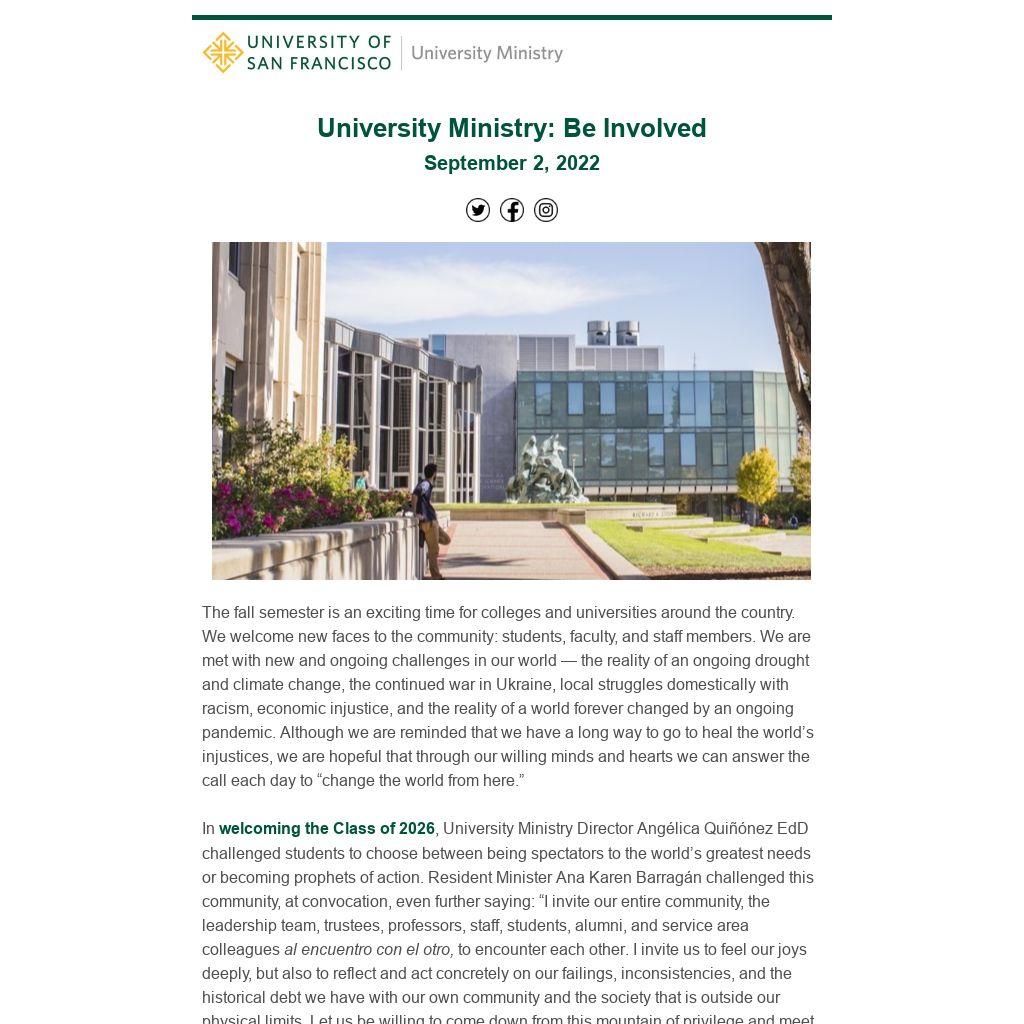 We are also excited to share with you what University Ministry has been working on over the past few weeks. We were excited to hold three major welcome events. We welcomed our new students at the Frosh Welcome and Transfer Welcome masses. We also held four first-year retreats in the span of two days serving close to 1,600 incoming students. Our resident ministers were also hard at work staffing our major events while also helping students move in and holding welcome events in their residence halls. Fr. Donal Godfrey, S.J. also led an excursion to the Castro District to learn about the history of the district and the work of Most Holy Redeemer parish — the first of many UM-led adventures! We are looking forward to all the different ways that we will continue to serve our community this academic year!