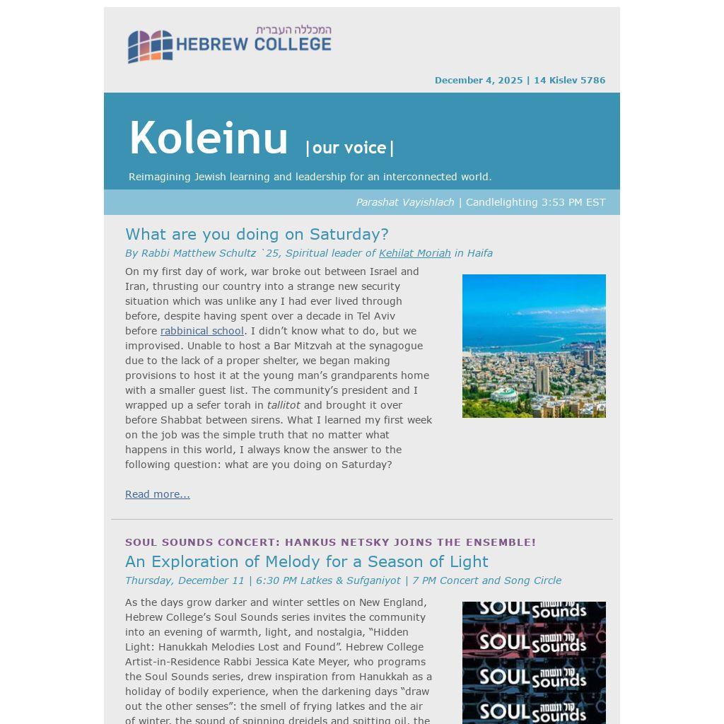 On my first day of work, war broke out between Israel and Iran, thrusting our country into a strange new security situation which was unlike any I had ever lived through before, despite having spent over a decade in Tel Aviv before rabbinical school. I didn’t know what to do, but we improvised. Unable to host a Bar Mitzvah at the synagogue due to the lack of a proper shelter, we began making provisions to host it at the young man’s grandparents home with a smaller guest list. The community’s president and I wrapped up a sefer torah in tallitot and brought it over before Shabbat between sirens. What I learned my first week on the job was the simple truth that no matter what happens in this world, I always know the answer to the following question: what are you doing on Saturday?