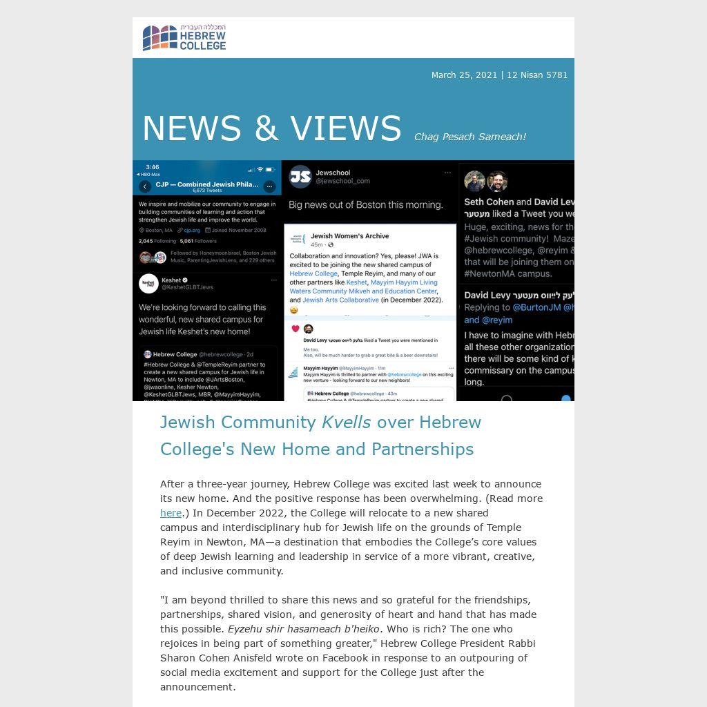 "I am beyond thrilled to share this news and so grateful for the friendships, partnerships, shared vision, and generosity of heart and hand that has made this possible. Eyzehu shir hasameach b'heiko. Who is rich? The one who rejoices in being part of something greater," Hebrew College President Rabbi Sharon Cohen Anisfeld wrote on Facebook in response to an outpouring of social media excitement and support for the College just after the announcement.