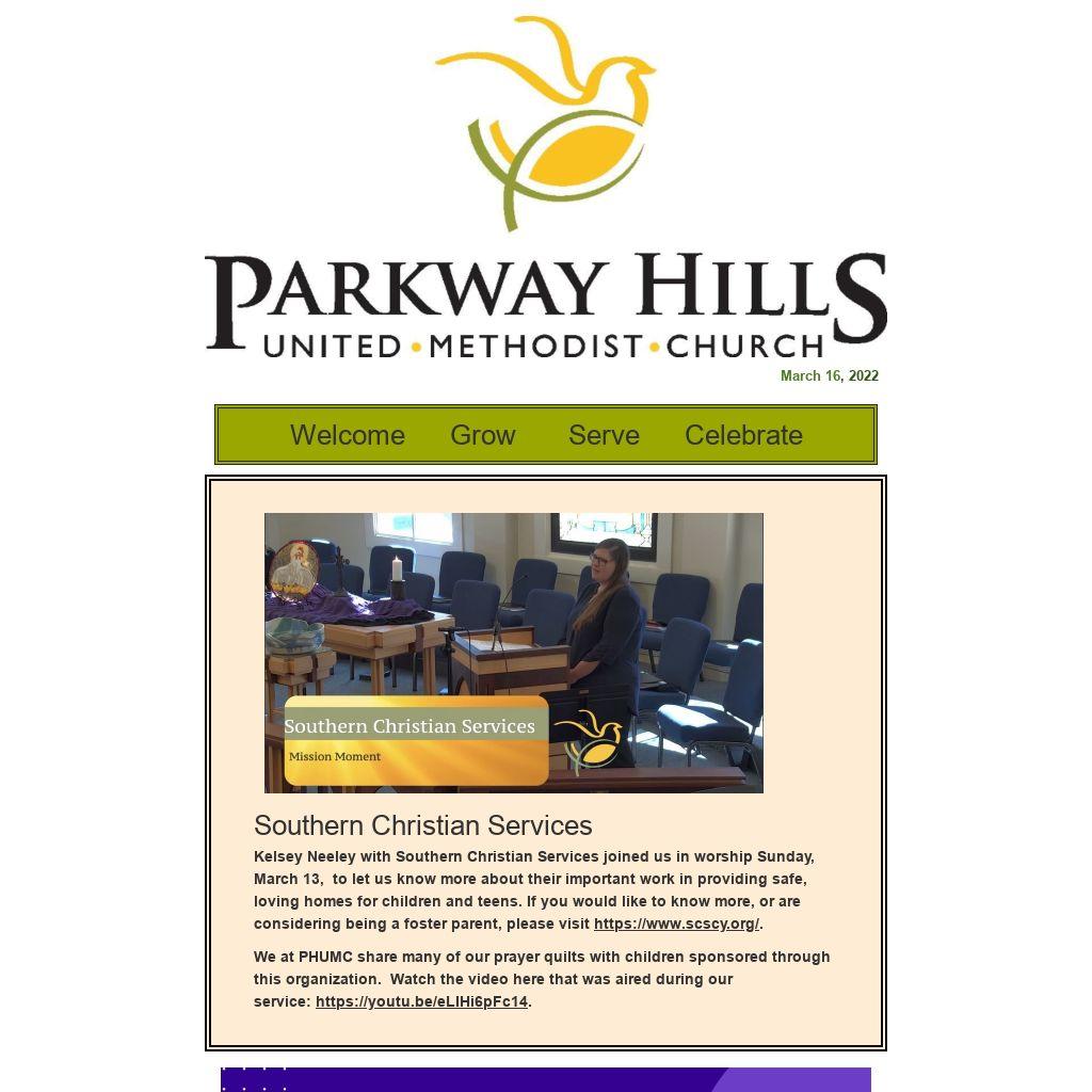 Choir practice this Sunday evening at 6:00 pm. Have a musical gift you would like to share? Reach out to our Director of Music, David White: david@parkwayhillsumc.org.