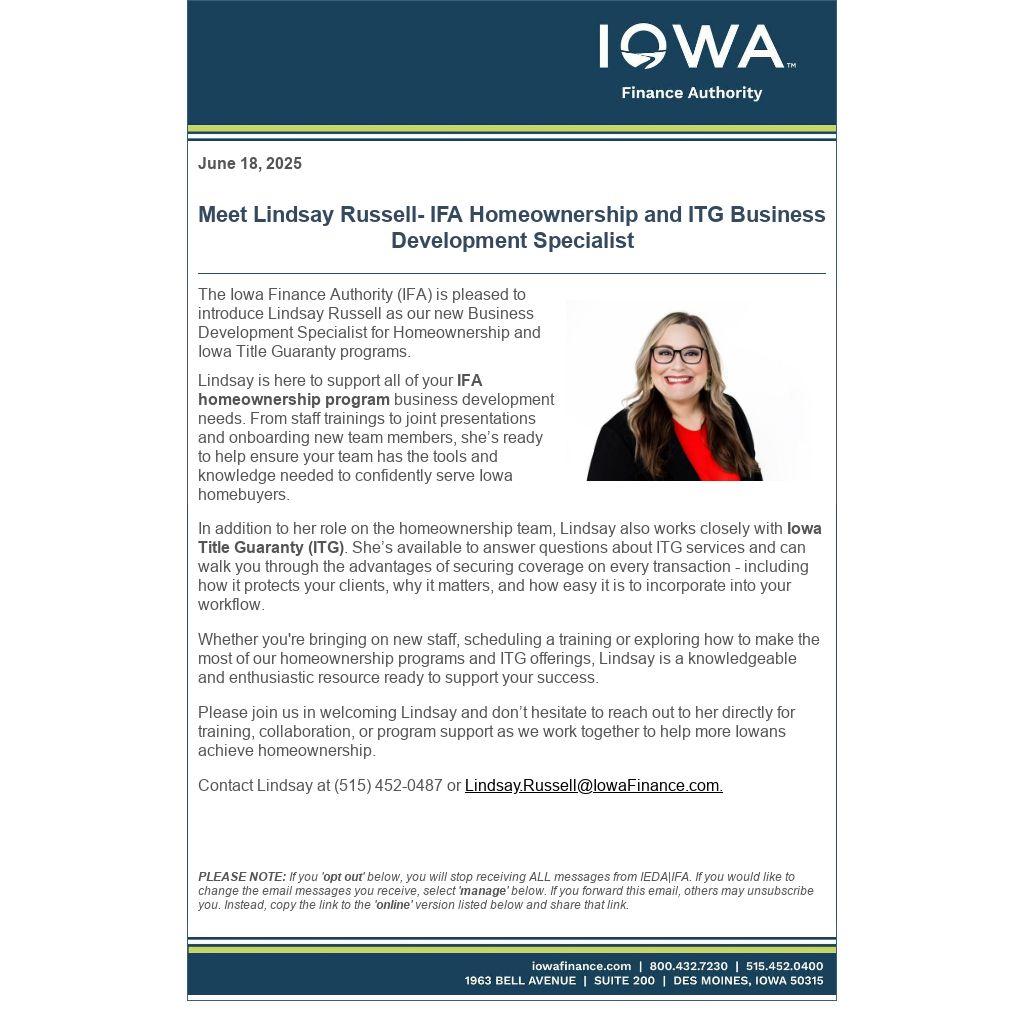 Contact Lindsay at (515) 452-0487 or Lindsay.Russell@IowaFinance.com.