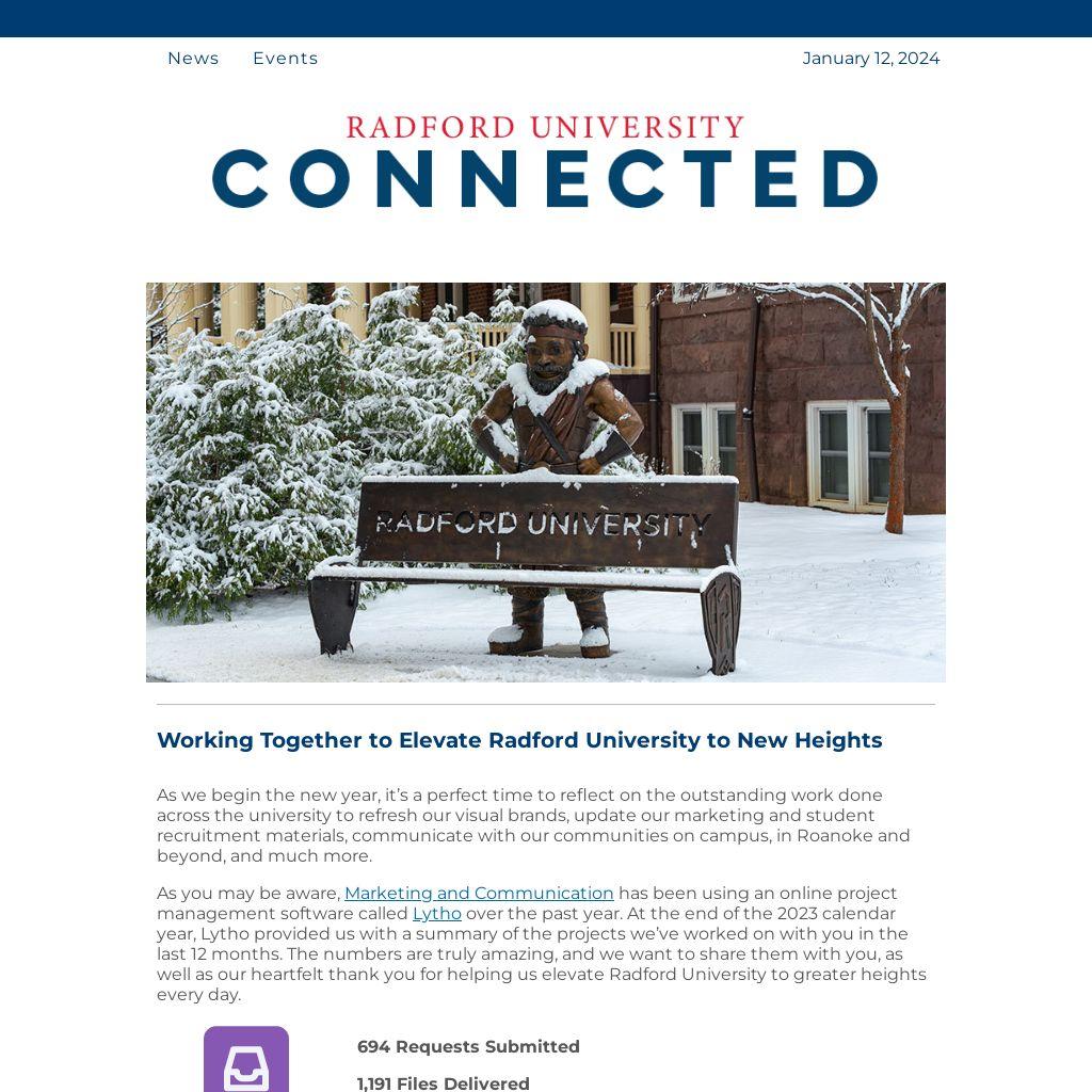 As you may be aware, Marketing and Communication has been using an online project management software called Lytho over the past year. At the end of the 2023 calendar year, Lytho provided us with a summary of the projects we’ve worked on with you in the last 12 months. The numbers are truly amazing, and we want to share them with you, as well as our heartfelt thank you for helping us elevate Radford University to greater heights every day.