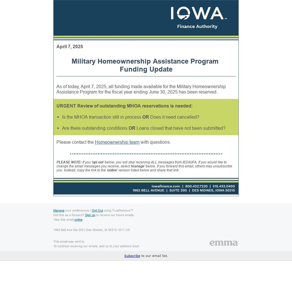 As of today, April 7, 2025, all funding made available for the Military Homeownership Assistance Program for the fiscal year ending June 30, 2025 has been reserved.