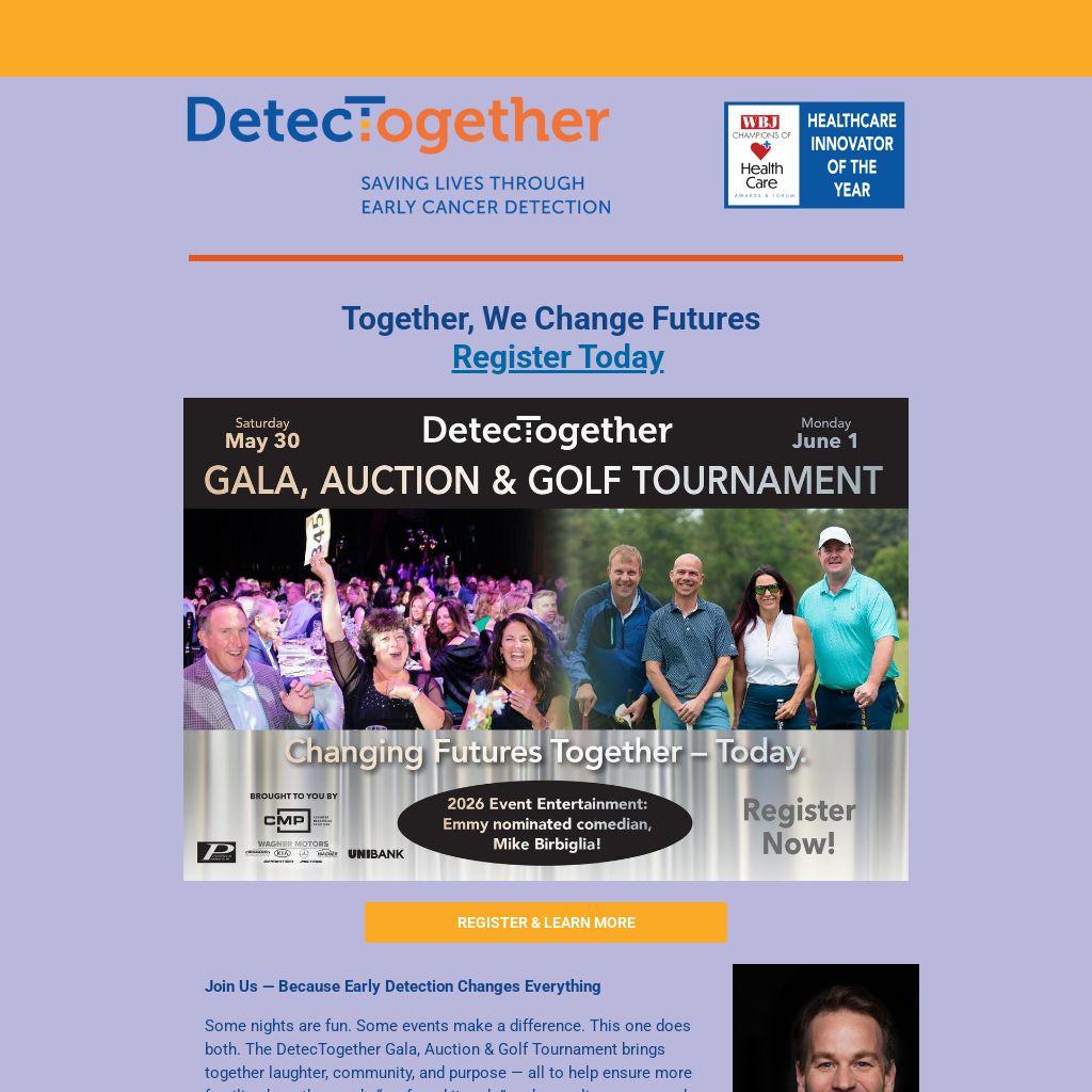 Some nights are fun. Some events make a difference. This one does both. The DetecTogether Gala, Auction & Golf Tournament brings together laughter, community, and purpose — all to help ensure more families hear the words “we found it early,” and more lives are saved because of it.
