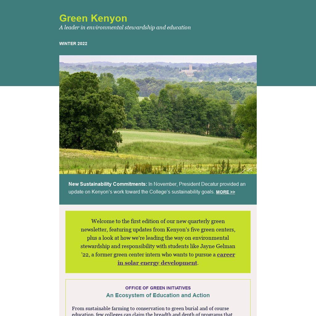 Welcome to the first edition of our new quarterly green newsletter, featuring updates from Kenyon's five green centers, plus a look at how we're leading the way on environmental stewardship and responsibility with students like Jayne Gelman ’22, a former green center intern who wants to pursue a career in solar energy development.