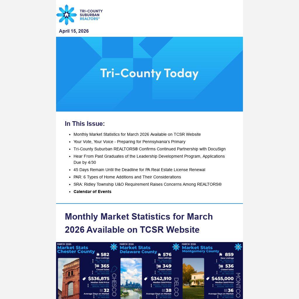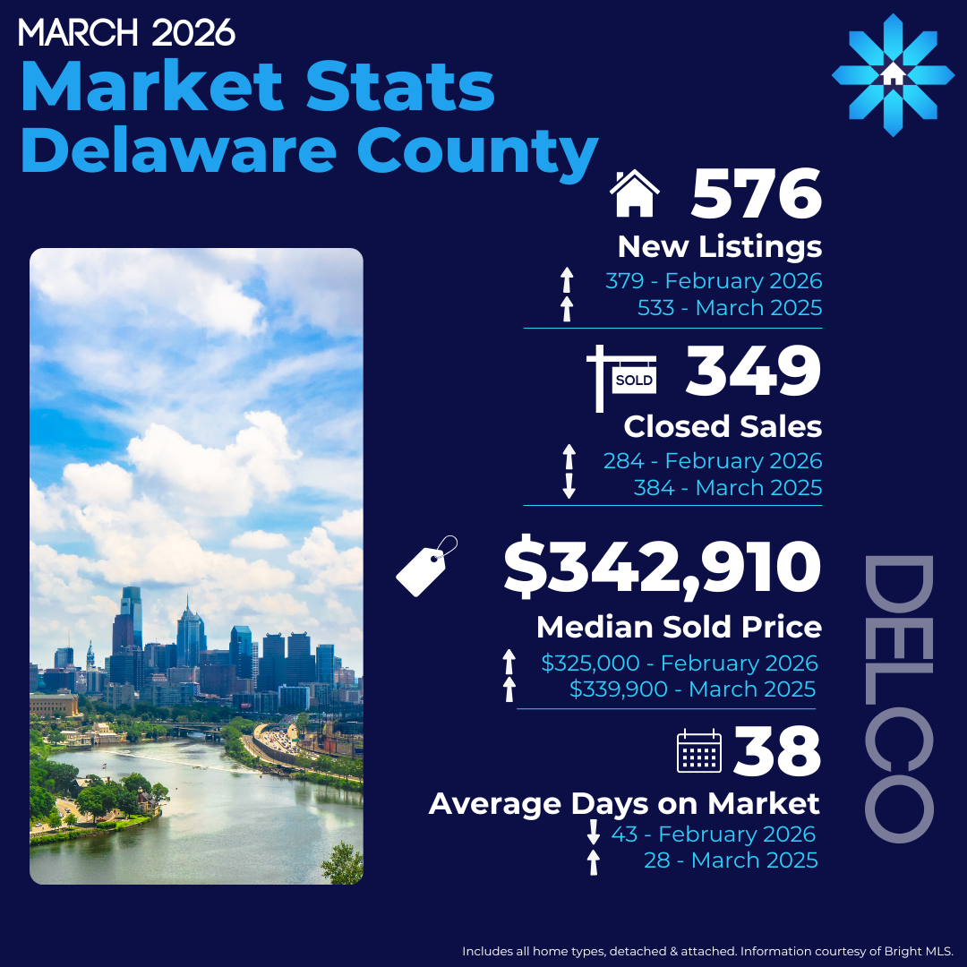 An assortment of reports is also available to Bright MLS subscribers at BrightMLS.com such as a monthly Market Report, and a Marketing ToolKit to coincide. The Philadelphia Metro March 2026 Housing Market Report will also offer monthly market data in that region with infographics, charts, and more. Tri-County's major counties (Chester, Delaware, and Montgomery) are included in this report. For more detailed report, once logged into Bright MLS, click the "Market" tab and choose the "Market Statistics Report" button in the drop-down menu to access various reports.
