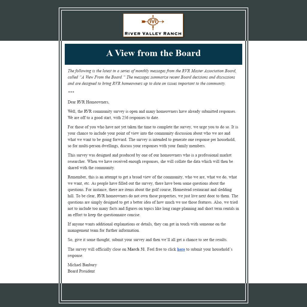 Well, the RVR community survey is open and many homeowners have already submitted responses. We are off to a good start, with 256 responses to date.