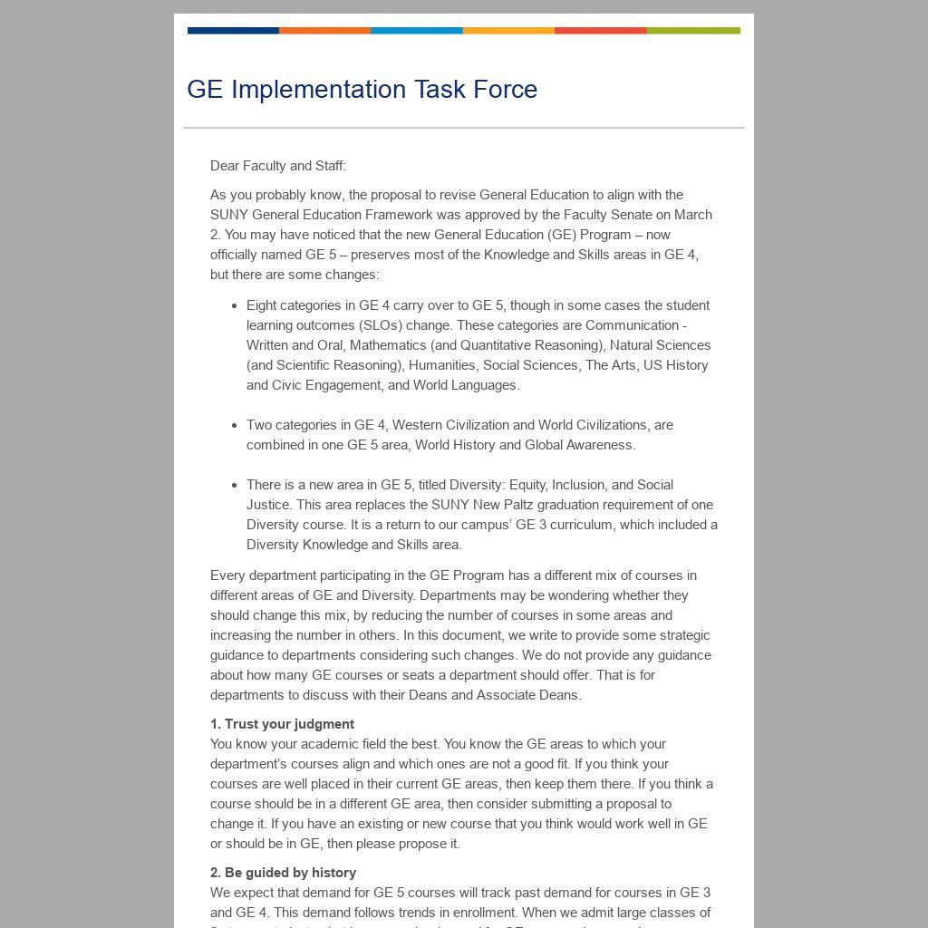 As you probably know, the proposal to revise General Education to align with the SUNY General Education Framework was approved by the Faculty Senate on March 2. You may have noticed that the new General Education (GE) Program – now officially named GE 5 – preserves most of the Knowledge and Skills areas in GE 4, but there are some changes: