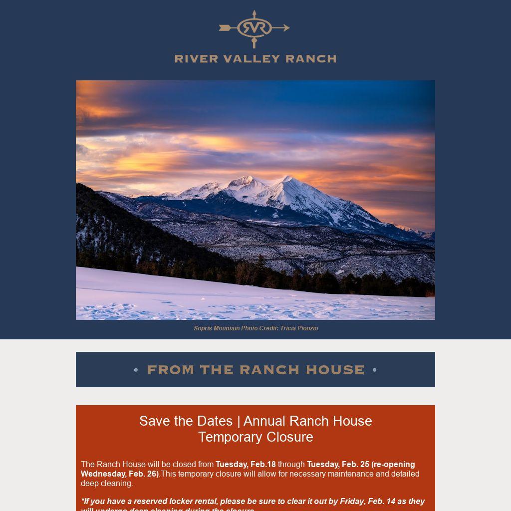 The Ranch House will be closed from Tuesday, Feb.18 through Tuesday, Feb. 25 (re-opening Wednesday, Feb. 26).This temporary closure will allow for necessary maintenance and detailed deep cleaning.