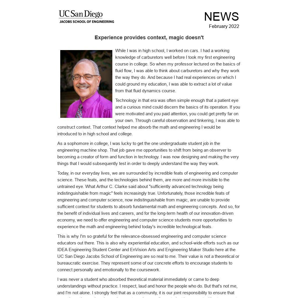 I was never a student who absorbed theoretical material immediately or came to deep understandings without practice. I respect, laud and honor the people who do. But that's not me, and I'm not alone. I strongly feel that as a community, it is our joint responsibility to ensure that every incoming engineering and computer science college student has opportunities to connect personally with the math and engineering and computing theory and fundamentals that will fuel their careers. Despite economic pressures, here at the Jacobs School of Engineering, we continue to strengthen these efforts.