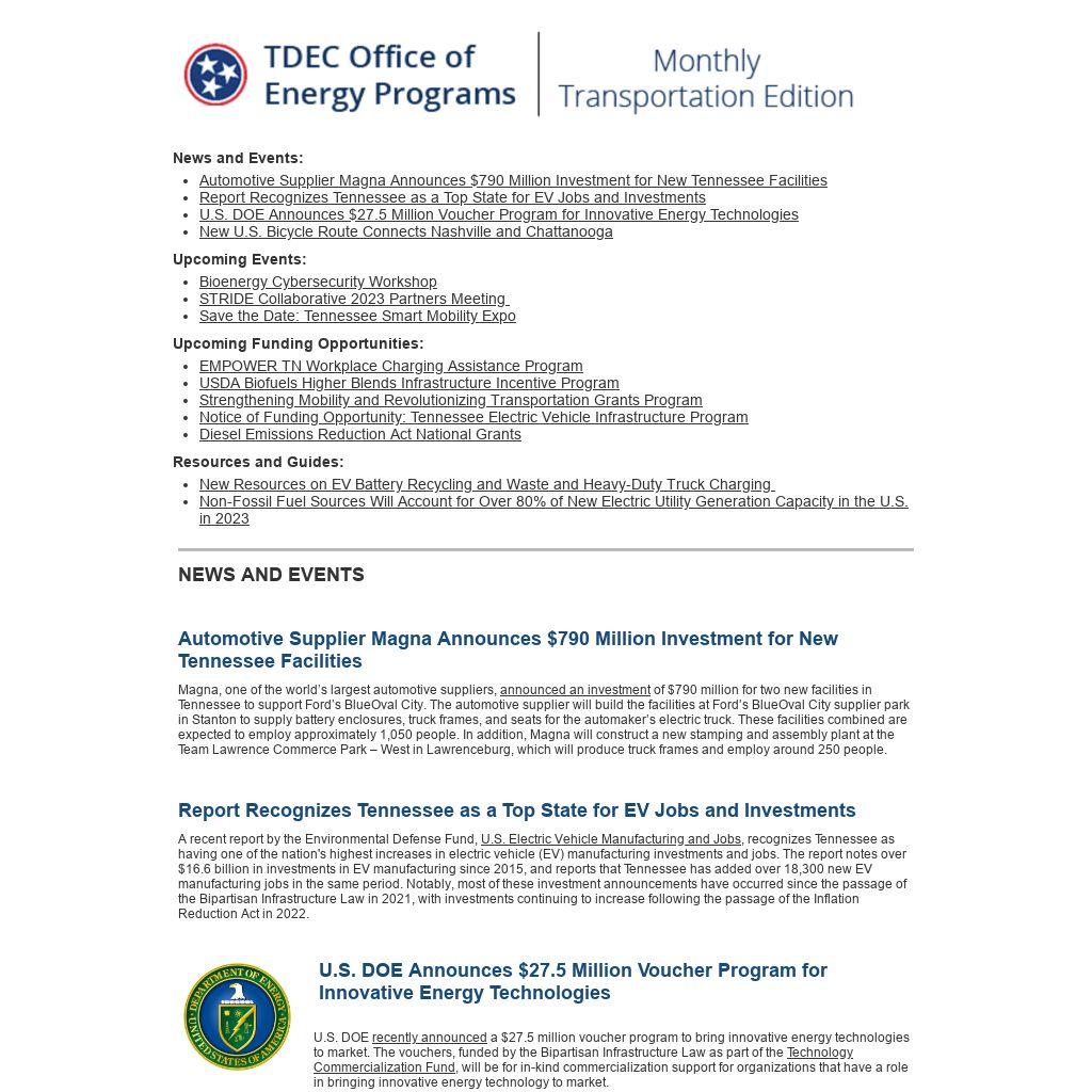 An informational application webinar was recently held, view the recording of the webinar here. For more information on the application process and program requirements, please visit the TDOT TEVI Program website. Questions regarding the NOFO may be submitted to TDOT.TEVI@tn.gov and will be addressed on the website in the FAQs section.