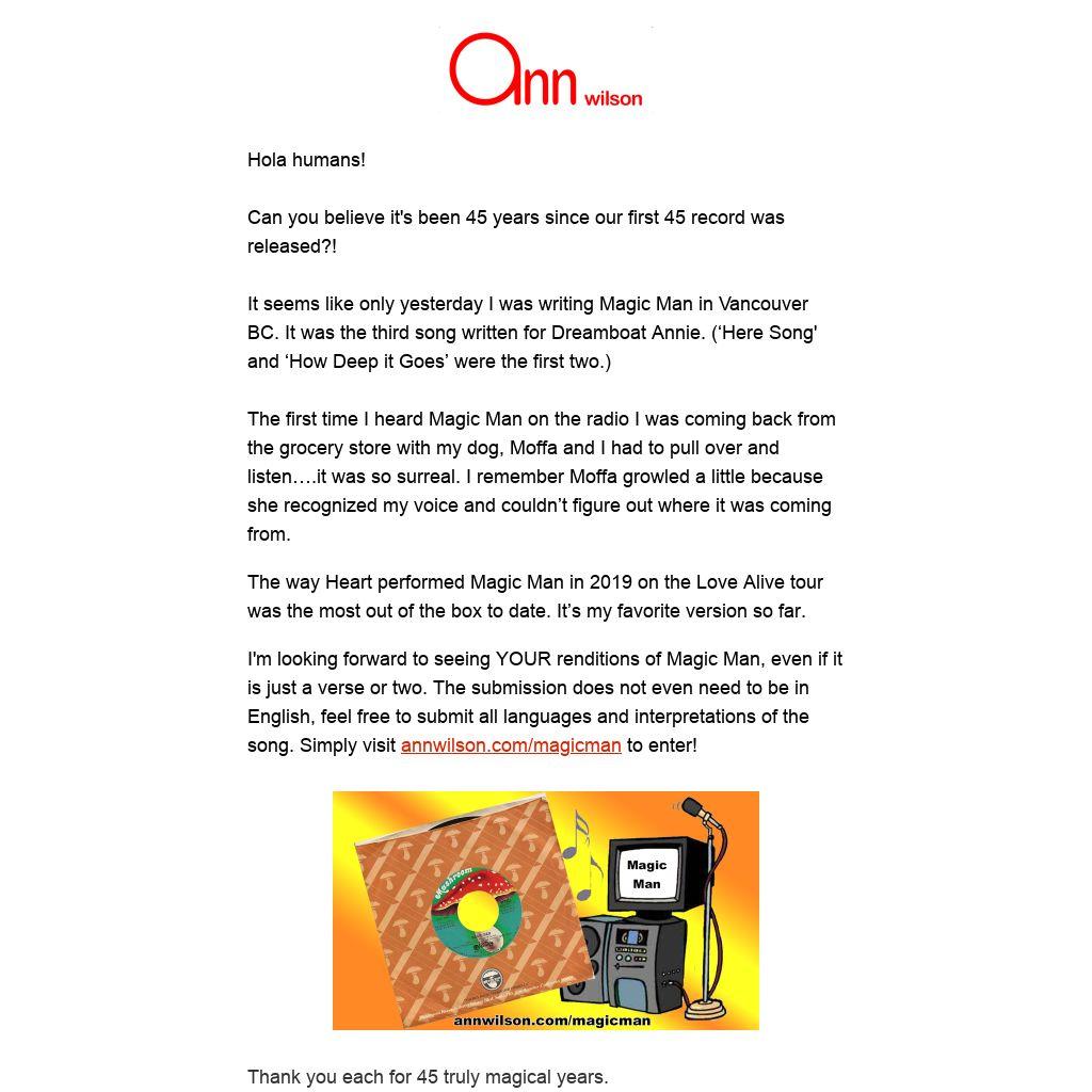 I'm looking forward to seeing YOUR renditions of Magic Man, even if it is just a verse or two. The submission does not even need to be in English, feel free to submit all languages and interpretations of the song. Simply visit annwilson.com/magicman to enter!