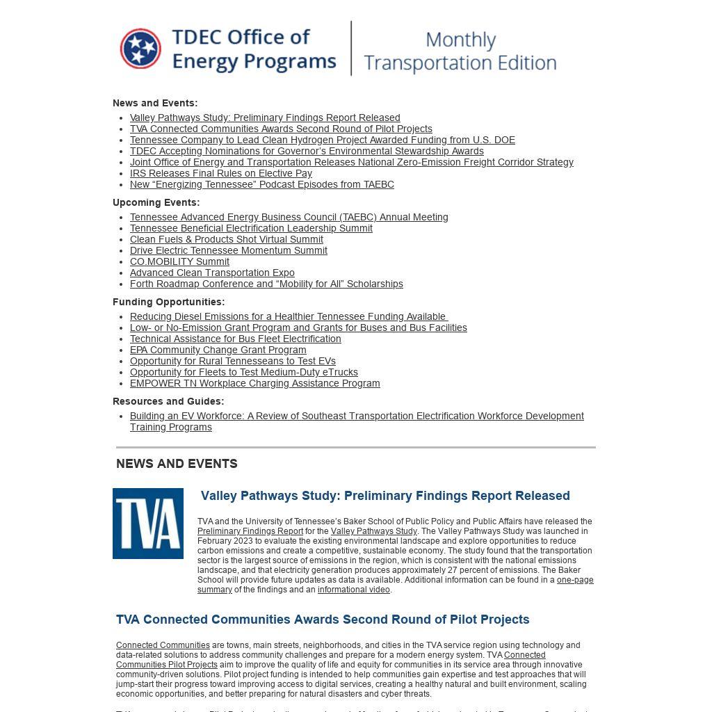 TVA and the University of Tennessee’s Baker School of Public Policy and Public Affairs have released the Preliminary Findings Report for the Valley Pathways Study. The Valley Pathways Study was launched in February 2023 to evaluate the existing environmental landscape and explore opportunities to reduce carbon emissions and create a competitive, sustainable economy. The study found that the transportation sector is the largest source of emissions in the region, which is consistent with the national emissions landscape, and that electricity generation produces approximately 27 percent of emissions. The Baker School will provide future updates as data is available. Additional information can be found in a one-page summary of the findings and an informational video.