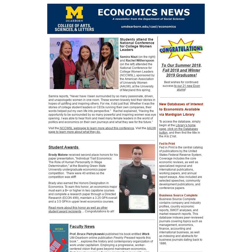 ECON 398 can be taken for three or six credit hours, three hours of which can be applied to your economics upper division course requirement. Students work on site for eight or 16 hours per week accordingly. Recent placements include Detroit Chamber of Commerce, Hantz Group, and Detroit Economic Growth Corporation.