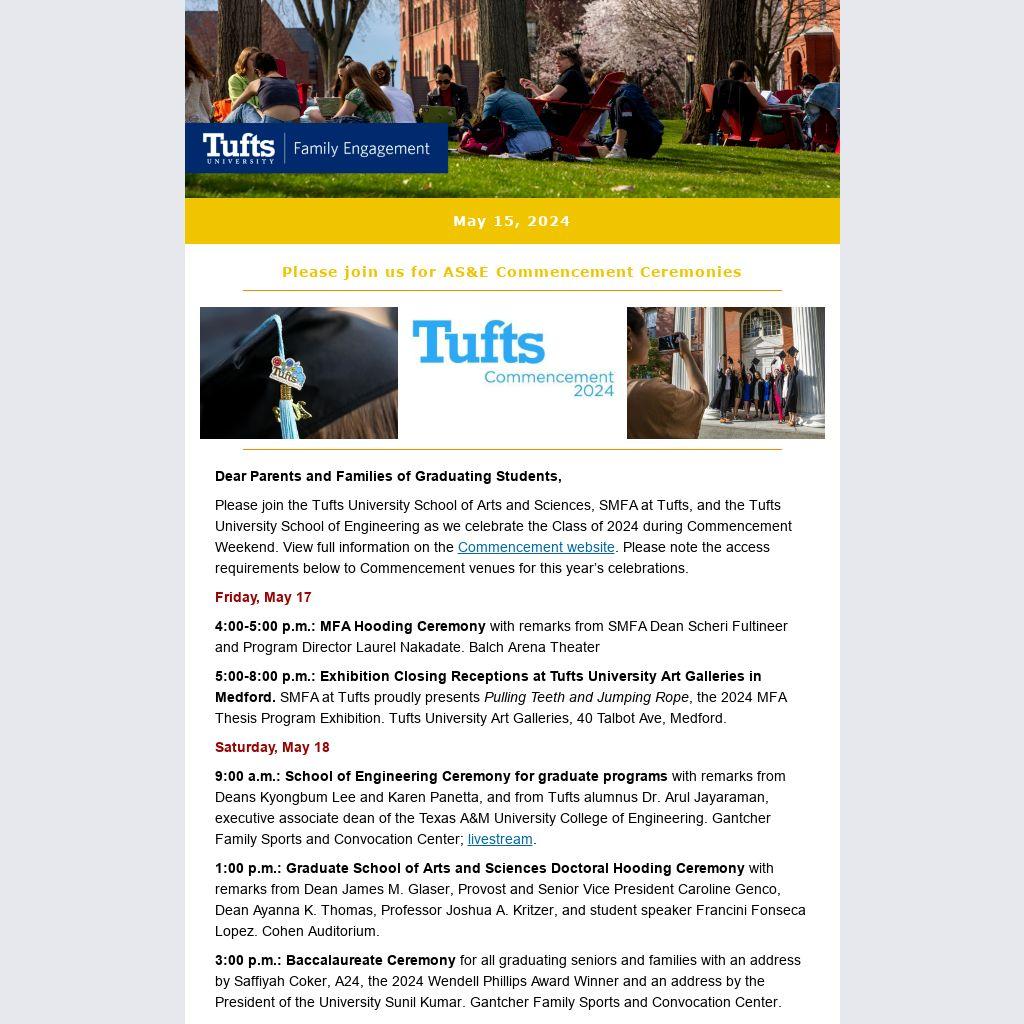 Please join the Tufts University School of Arts and Sciences, SMFA at Tufts, and the Tufts University School of Engineering as we celebrate the Class of 2024 during Commencement Weekend. View full information on the Commencement website. Please note the access requirements below to Commencement venues for this year’s celebrations.