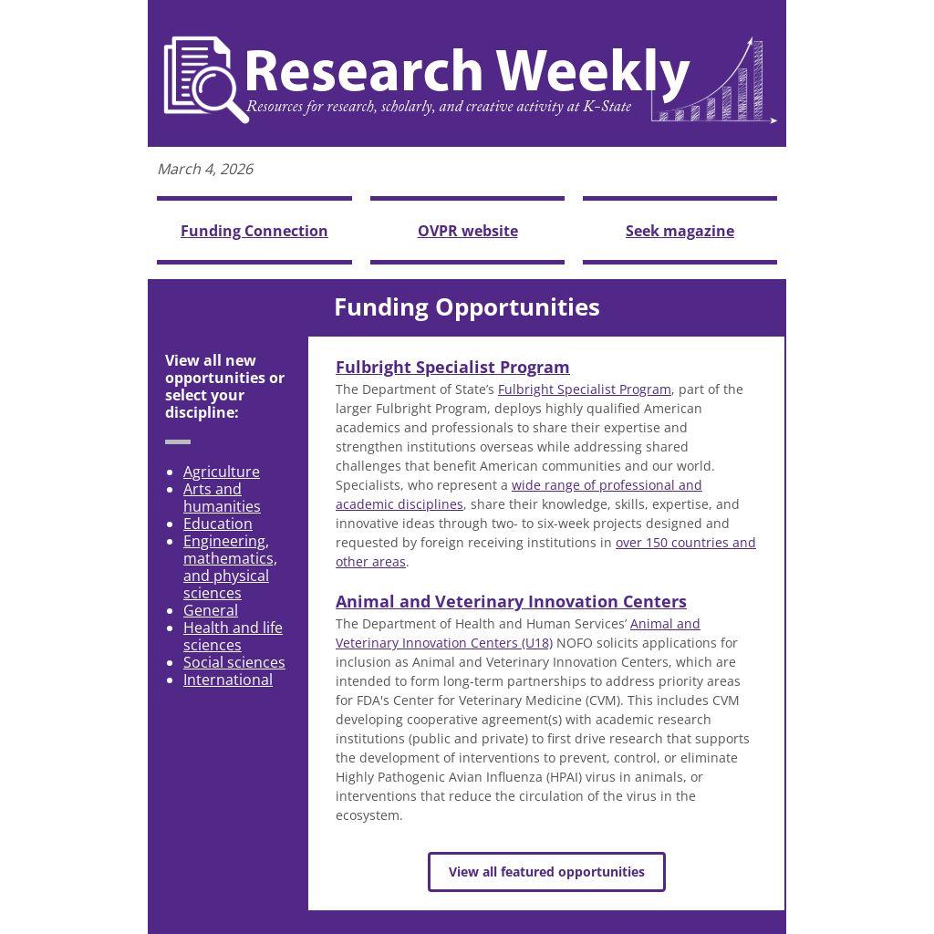 The Patterson Family Foundation (PFF) released its call for Round Two of their 2026 Grant Opportunities with LOIs due by May 13, 2026, and invited full proposals due by June 29, 2026. This foundation limits the number of LOIs that can be submitted by an organization. As such, there will be a limited submission competition that will be used by the Office of Research Development to determine which LOI’s will go forward from K-State and the K-State Foundation.