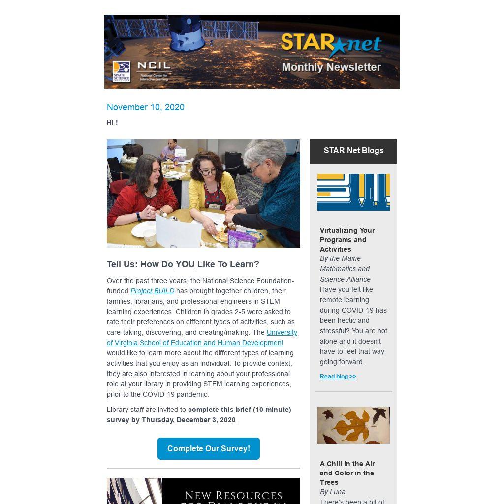 The STAR Library Network (STAR Net) is a hands-on learning network for libraries and their communities across the country. STAR Net focuses on helping library professionals build their STEM skills by providing “science-technology activities and resources” (STAR) and training to use those resources.