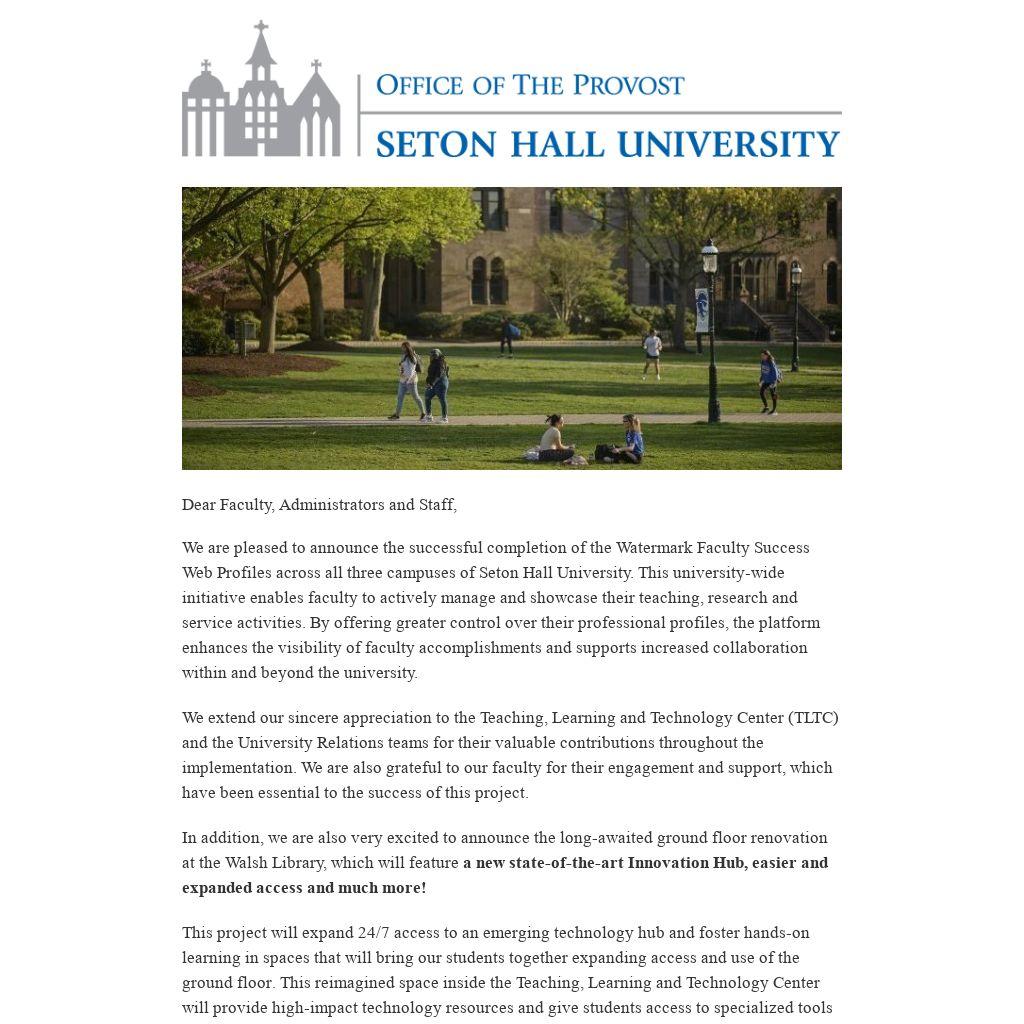 We are pleased to announce the successful completion of the Watermark Faculty Success Web Profiles across all three campuses of Seton Hall University. This university-wide initiative enables faculty to actively manage and showcase their teaching, research and service activities. By offering greater control over their professional profiles, the platform enhances the visibility of faculty accomplishments and supports increased collaboration within and beyond the university.