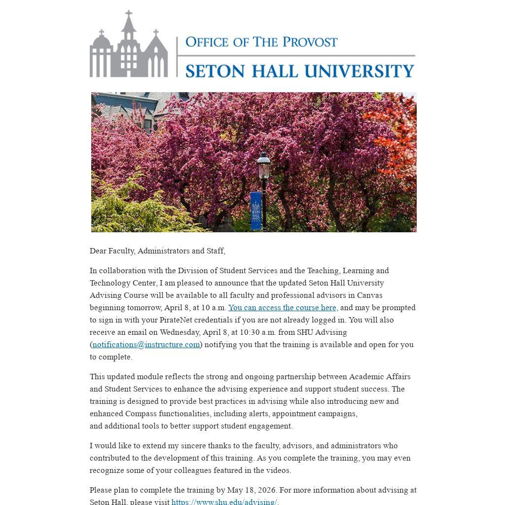 In collaboration with the Division of Student Services and the Teaching, Learning and Technology Center, I am pleased to announce that the updated Seton Hall University Advising Course will be available to all faculty and professional advisors in Canvas beginning tomorrow, April 8, at 10 a.m. You can access the course here, and may be prompted to sign in with your PirateNet credentials if you are not already logged in. You will also receive an email on Wednesday, April 8, at 10:30 a.m. from SHU Advising (notifications@instructure.com) notifying you that the training is available and open for you to complete.
