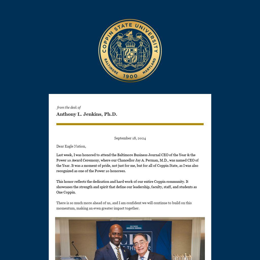 Last week, I was honored to attend the Baltimore Business Journal CEO of the Year & the Power 10 Award Ceremony, where our Chancellor Jay A. Perman, M.D., was named CEO of the Year. It was a moment of pride, not just for me, but for all of Coppin State, as I was also recognized as one of the Power 10 honorees.