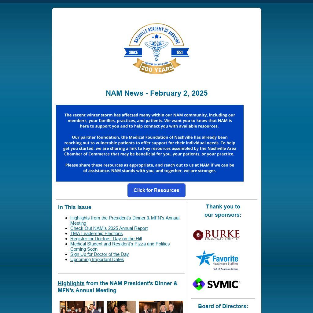 Explore the 2025 Nashville Academy of Medicine Annual Report, highlighting our dedicated Board of Directors and our mission to support physicians, practices, and community health. With 92 specialties and subspecialties and a growing membership of more than 2,200 physicians, NAM continues to make a lasting impact.