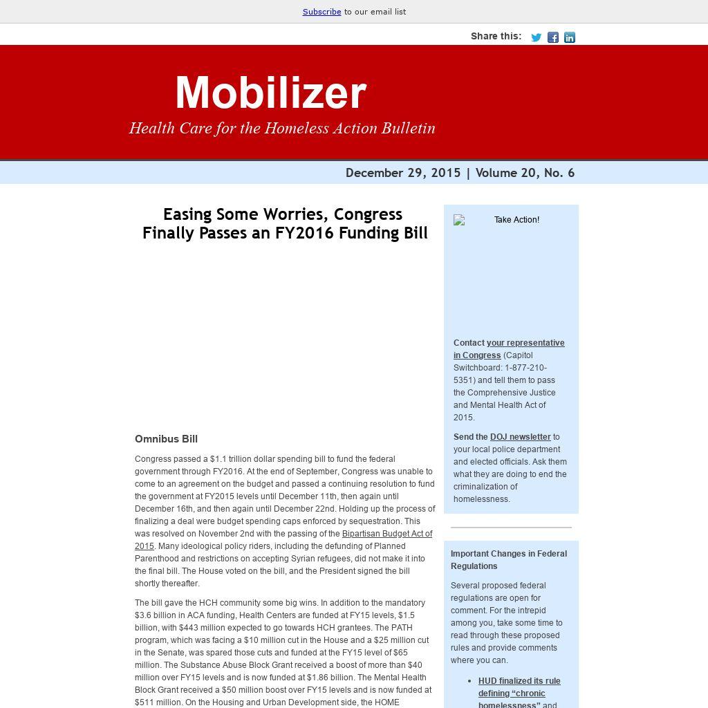 Omnibus Bill Congress passed a $1.1 trillion dollar spending bill to fund the federal government through FY2016. At the end of September, Congress was unable to come to an agreement on the budget and passed a continuing resolution to fund the government at FY2015 levels until December 11th, then again until December 16th, and then again until December 22nd. Holding up the process of finalizing a deal were budget spending caps enforced by sequestration. This was resolved on November 2nd with the passing of the Bipartisan Budget Act of 2015. Many ideological policy riders, including the defunding of Planned Parenthood and restrictions on accepting Syrian refugees, did not make it into the final bill. The House voted on the bill, and the President signed the bill shortly thereafter. The bill gave the HCH community some big wins. In addition to the mandatory $3.6 billion in ACA funding, Health Centers are funded at FY15 levels, $1.5 billion, with $443 million expected to go towards HCH grantees. The PATH program, which was facing a $10 million cut in the House and a $25 million cut in the Senate, was spared those cuts and funded at the FY15 level of $65 million. The Substance Abuse Block Grant received a boost of more than $40 million over FY15 levels and is now funded at $1.86 billion. The Mental Health Block Grant received a $50 million boost over FY15 levels and is now funded at $511 million. On the Housing and Urban Development side, the HOME program, which was facing drastic cuts in both the House and Senate, was given a $50 million boost from FY15 levels and is now funded at $950 million. The Housing Choice Voucher program was funded at $19.6 billion, providing enough to maintain all current vouchers in use and add an additional $65 million in HUD-VASH vouchers (reserved for veterans). And last but not least, the McKinney Homeless Assistance Grants were given a slight boost from FY15 levels to $2.25 billion. For a more detailed look at funding levels, see the funding status of programs supporting the HCH community. The National Housing Trust Fund survived the chopping block, avoiding an attempt by the House to essentially eradicate the program. The NHTF is money designated solely for the production, preservation, and operation of predominately affordable rental housing for extremely low-income households (less than 30% of area median income). This is great news as we face a growing affordable rental housing crisis, as detailed in a new report America’s Rental Housing: Expanding Options for Diverse and Growing Demand by the Joint Center for Housing Studies at Harvard University. It is expected that the program will begin distributing resources to states in 2016. Some other interesting points in the bill include: the expansion of the Moving to Work Demonstration by 100 additional sites, which allows participating state and local housing agencies broad authority over the use of funds and to implement policies such as attaching housing to work requirements; state and local public health departments were given authority to use federal funds to support services related to syringe exchange programs (as long as the funds were not used to purchase the syringes); and an additional $12 million was provided for states to provide grants to equip and train first responders with the use of devices that rapidly reverse the effects of opioids. Lastly, the bill includes a very important bipartisan agreement to request that the Capitol Police allow sledding on Capitol Hill. In early 2015 it was announced that sledding would be banned due to security reasons. Rest assured that Congress has addressed this critical issue; you can sled on Capitol Hill (that is, if we ever dip below 50 degree temperatures and experience a winter this year).