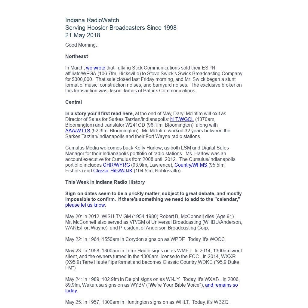 Indiana RadioWatch subscriptions are free. To subscribe, send an e-mail to irw@well.com and we'll add you. After publication, we archive Indiana RadioWatch on the Indiana Radio Archive at http://www.indianaradio.net. Please e-mail us your news stories and employment opportunities.