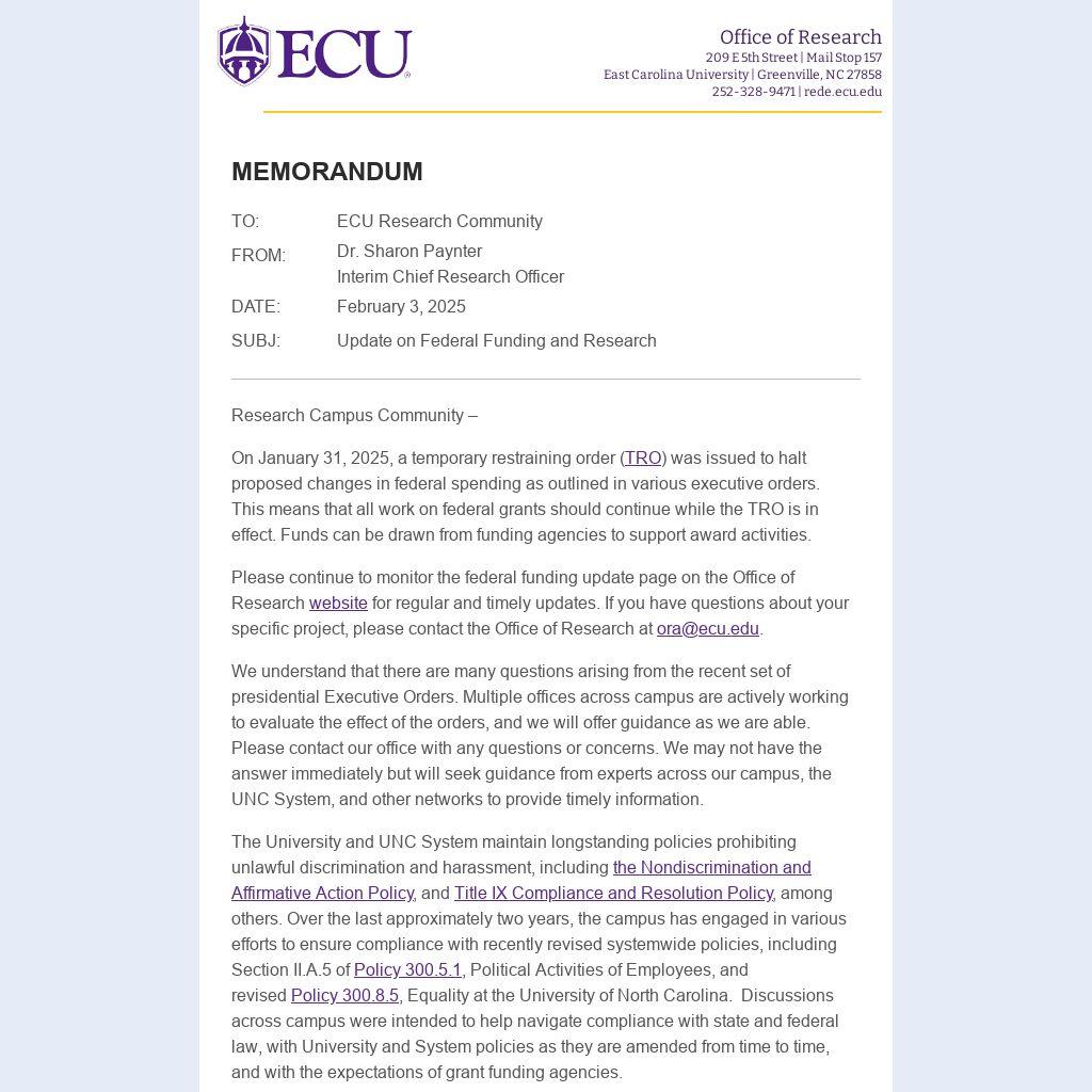 Please continue to monitor the federal funding update page on the Office of Research website for regular and timely updates. If you have questions about your specific project, please contact the Office of Research at ora@ecu.edu.