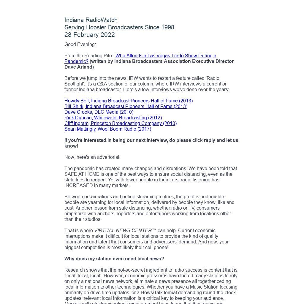Before we jump into the news, IRW wants to restart a feature called 'Radio Spotlight'. It's a Q&A section of our column, where IRW interviews a current or former Indiana broadcaster. Here's a few interviews we've done over the years: