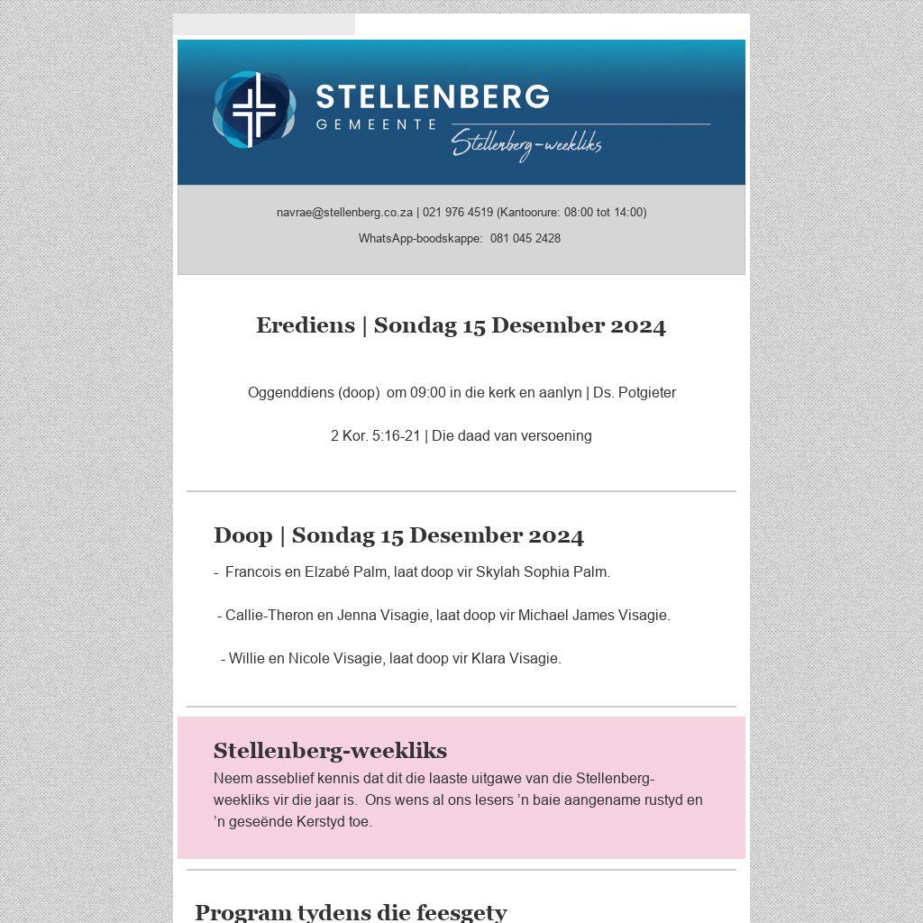 Plaas gerus ’n advertensie in die Stellenberg-weekliks. Die nuusblad word tans weekliks elektronies aan 2 500 persone gestuur en is ook op die gemeente se webwerf beskikbaar. Advertensies sal slegs aanlyn beskikbaar wees en word nie in gedrukte formaat uitgegee nie. Lees meer . . .