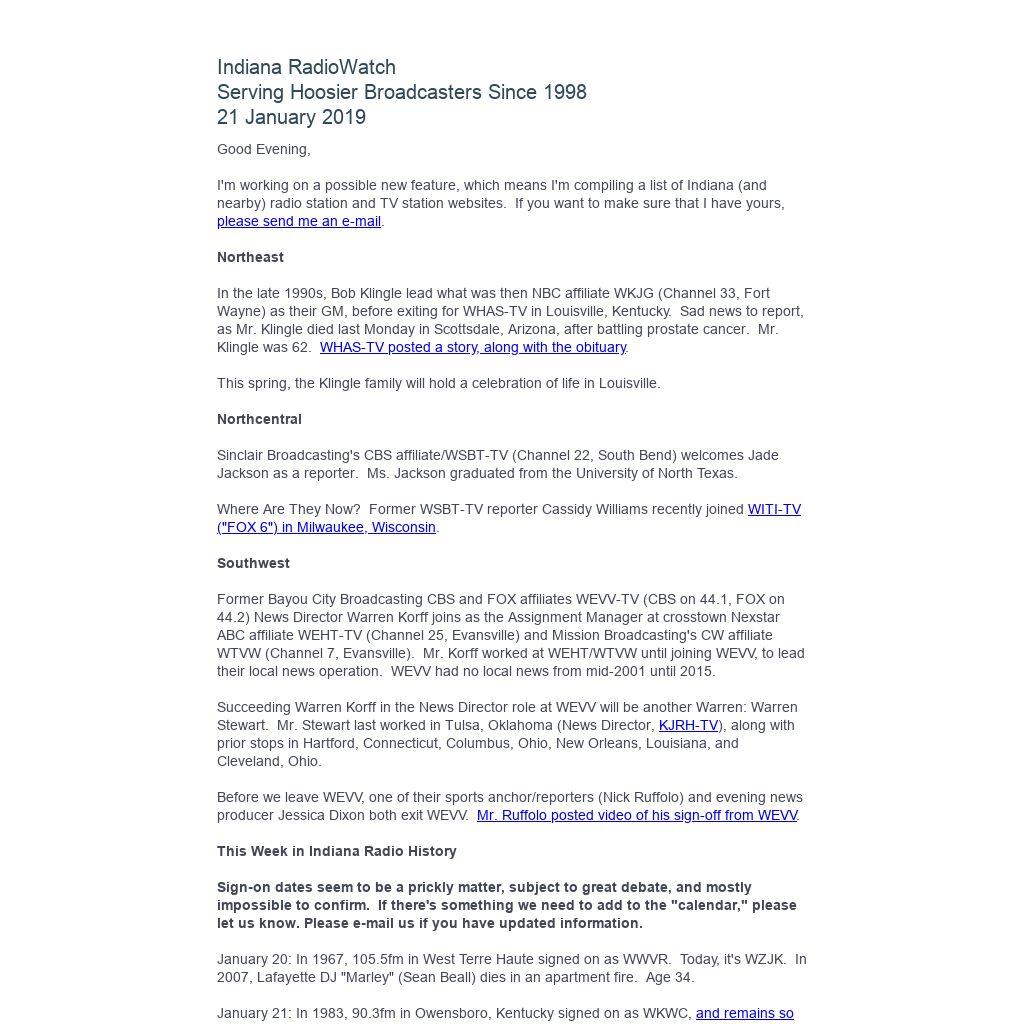 Indiana RadioWatch subscriptions are free. To subscribe, send an e-mail to irw@well.com and we'll add you. After publication, we archive Indiana RadioWatch on the Indiana Radio Archive at http://www.indianaradio.net. Please e-mail us your news stories and employment opportunities.