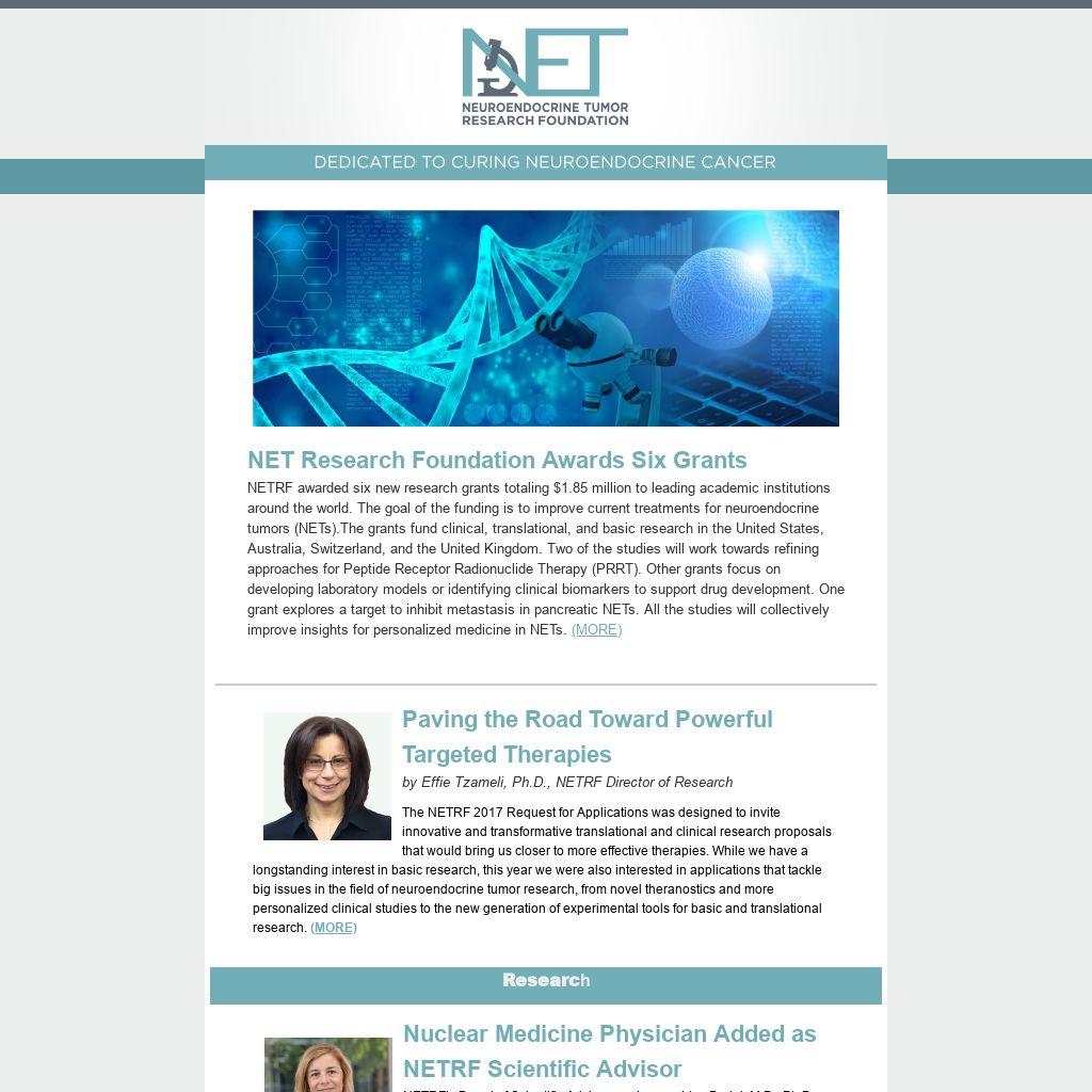NET Research Foundation Awards Six Grants NETRF awarded six new research grants totaling $1.85 million to leading academic institutions around the world. The goal of the funding is to improve current treatments for neuroendocrine tumors (NETs).The grants fund clinical, translational, and basic research in the United States, Australia, Switzerland, and the United Kingdom. Two of the studies will work towards refining approaches for Peptide Receptor Radionuclide Therapy (PRRT). Other grants focus on developing laboratory models or identifying clinical biomarkers to support drug development. One grant explores a target to inhibit metastasis in pancreatic NETs. All the studies will collectively improve insights for personalized medicine in NETs. (MORE)