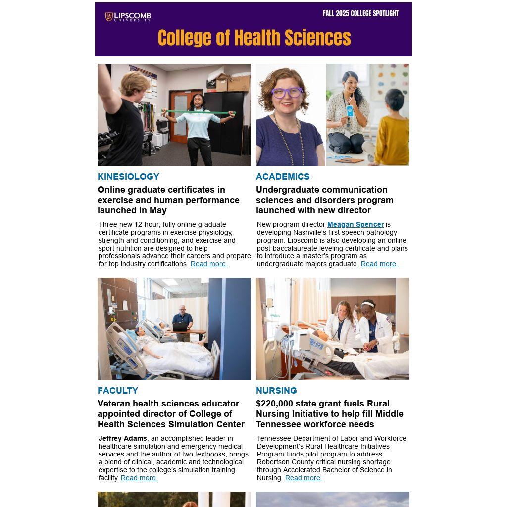 On Oct. 9, the college hosted a Health Sciences Fair, which is designed for medical schools, PA programs, PT programs, optometry schools, Nurse Practitioner programs and other healthcare-related programs, to recruit Lipscomb students who would like to pursue careers in the health sciences that require master's or doctoral degrees.