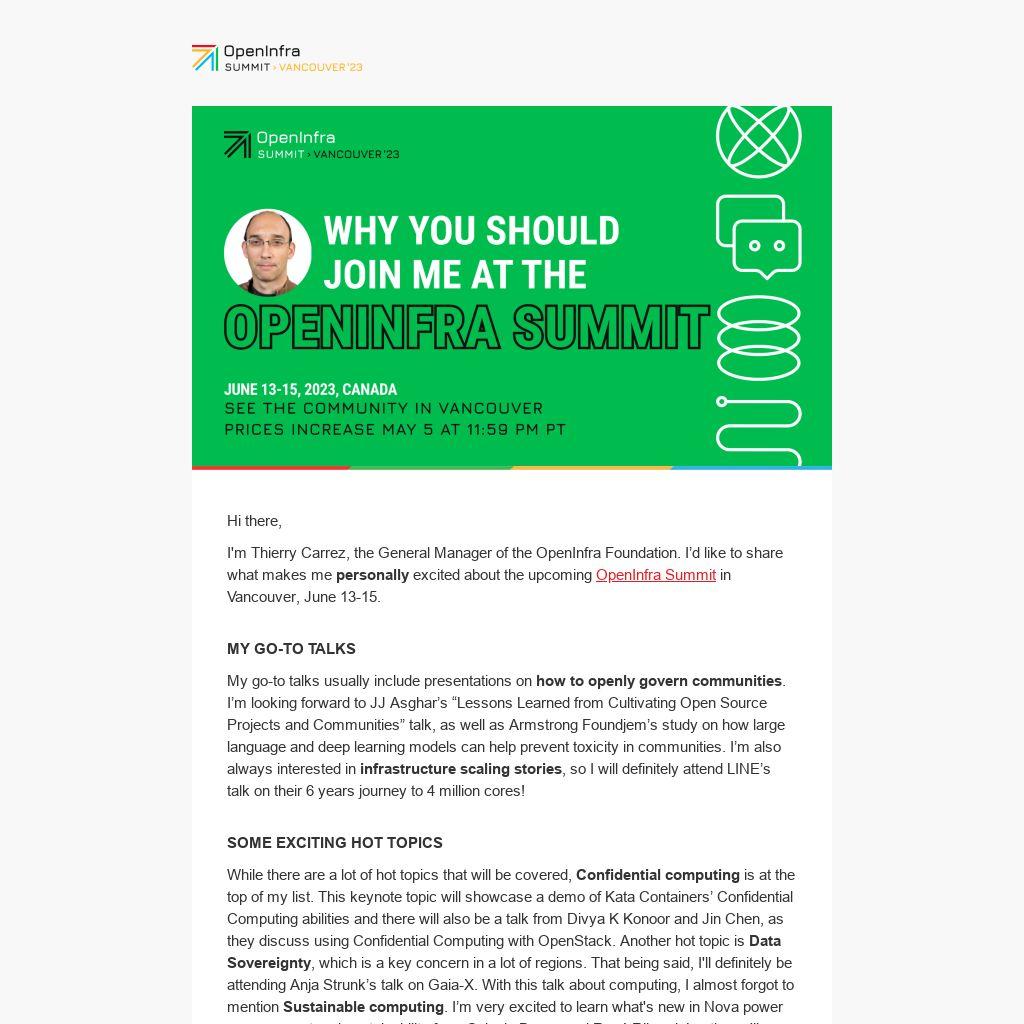 While there are a lot of hot topics that will be covered, Confidential computing is at the top of my list. This keynote topic will showcase a demo of Kata Containers’ Confidential Computing abilities and there will also be a talk from Divya K Konoor and Jin Chen, as they discuss using Confidential Computing with OpenStack. Another hot topic is Data Sovereignty, which is a key concern in a lot of regions. That being said, I'll definitely be attending Anja Strunk’s talk on Gaia-X. With this talk about computing, I almost forgot to mention Sustainable computing. I’m very excited to learn what's new in Nova power management and sustainability from Sylvain Bauza and René Ribaud. Lastly, we'll cover how Artificial Intelligence drives infrastructure requirements, including a keynote explaining how NVIDIA uses OpenStack Swift internally.