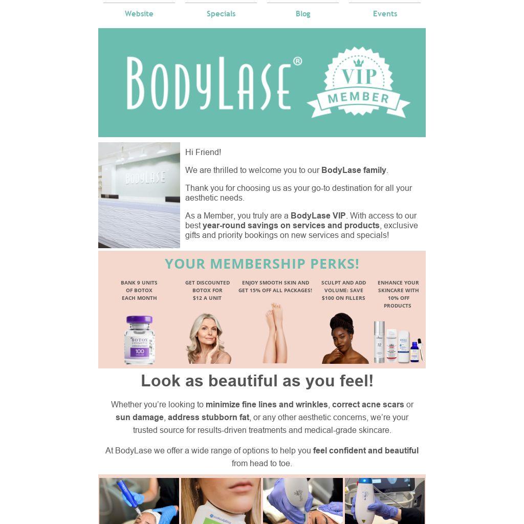 As a Member, you truly are a BodyLase VIP. With access to our best year-round savings on services and products, exclusive gifts and priority bookings on new services and specials!