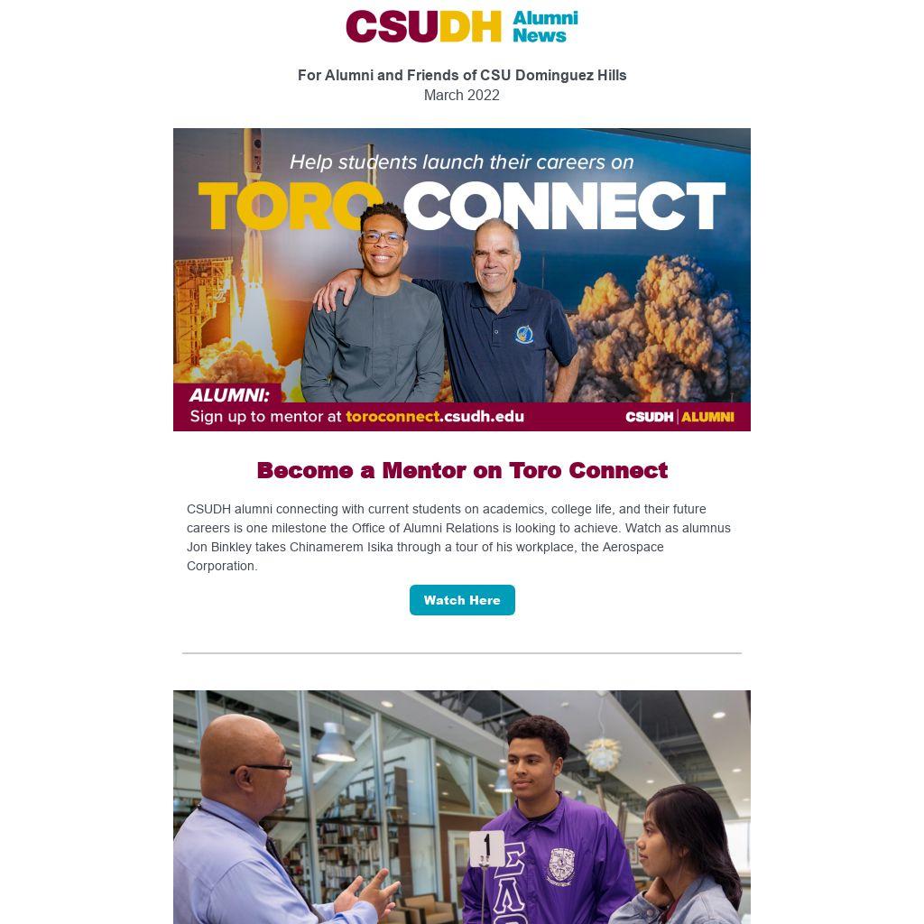 Whether you’re a CSUDH alum who wants to share your knowledge and advice with an up-and-coming protégé, or a Toro student looking for a mentor in your field, the new Toro Connect platform promises to make establishing those relationships easier than ever...