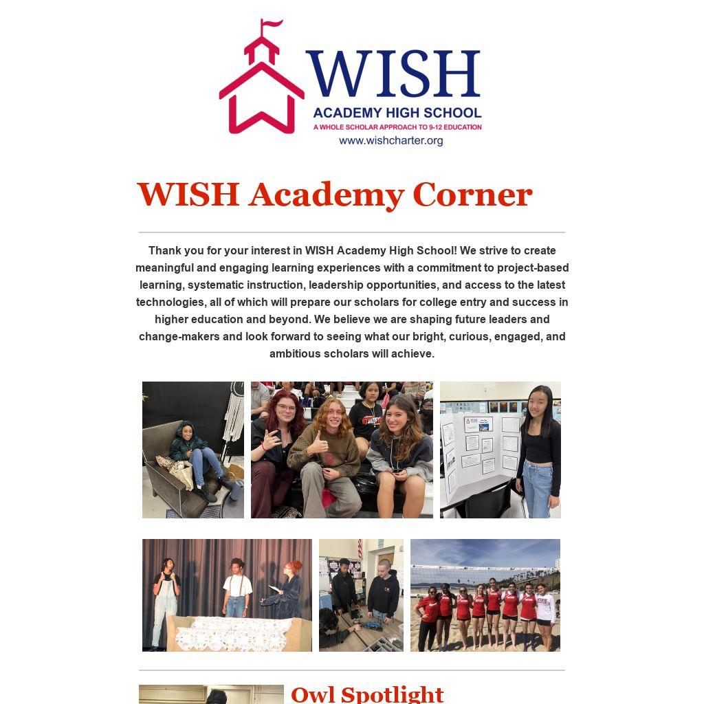 Thank you for your interest in WISH Academy High School! We strive to create meaningful and engaging learning experiences with a commitment to project-based learning, systematic instruction, leadership opportunities, and access to the latest technologies, all of which will prepare our scholars for college entry and success in higher education and beyond. We believe we are shaping future leaders and change-makers and look forward to seeing what our bright, curious, engaged, and ambitious scholars will achieve.