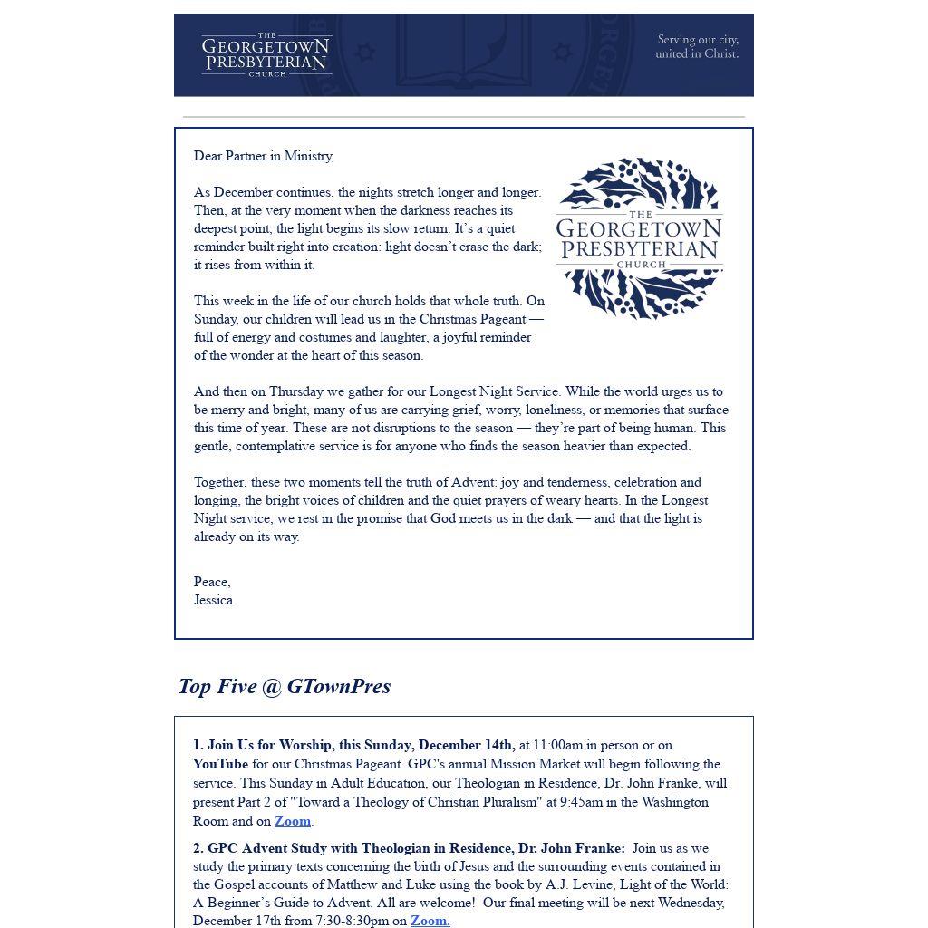 And then on Thursday we gather for our Longest Night Service. While the world urges us to be merry and bright, many of us are carrying grief, worry, loneliness, or memories that surface this time of year. These are not disruptions to the season — they’re part of being human. This gentle, contemplative service is for anyone who finds the season heavier than expected.