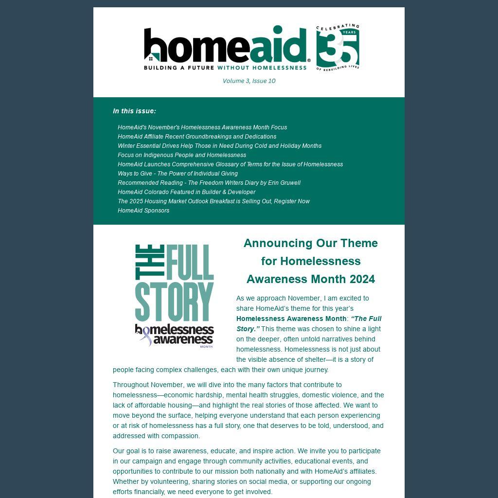As we approach November, I am excited to share HomeAid’s theme for this year’s Homelessness Awareness Month: “The Full Story.” This theme was chosen to shine a light on the deeper, often untold narratives behind homelessness. Homelessness is not just about the visible absence of shelter—it is a story of people facing complex challenges, each with their own unique journey.