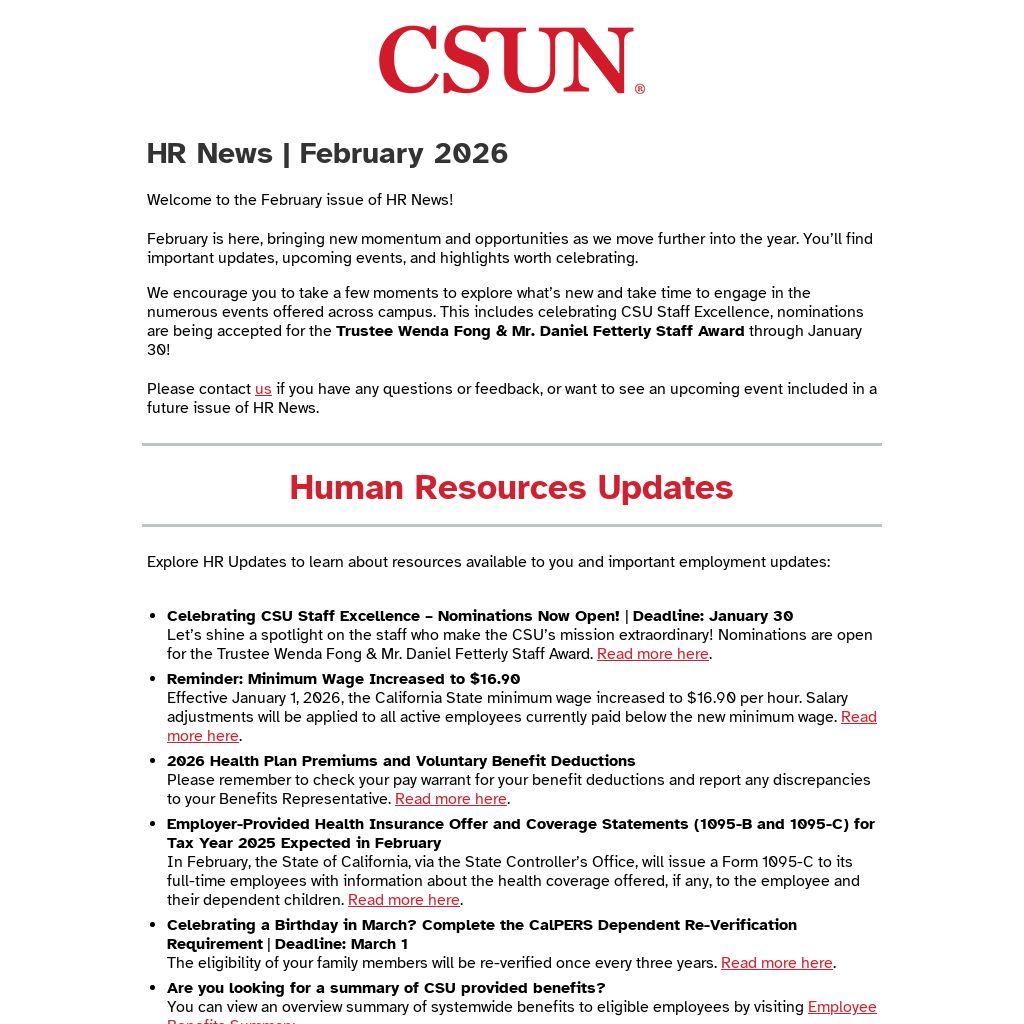 Let’s shine a spotlight on the staff who make the CSU’s mission extraordinary! Nominations are open for the Trustee Wenda Fong & Mr. Daniel Fetterly Staff Award. Read more here. - Reminder: Minimum Wage Increased to $16.90