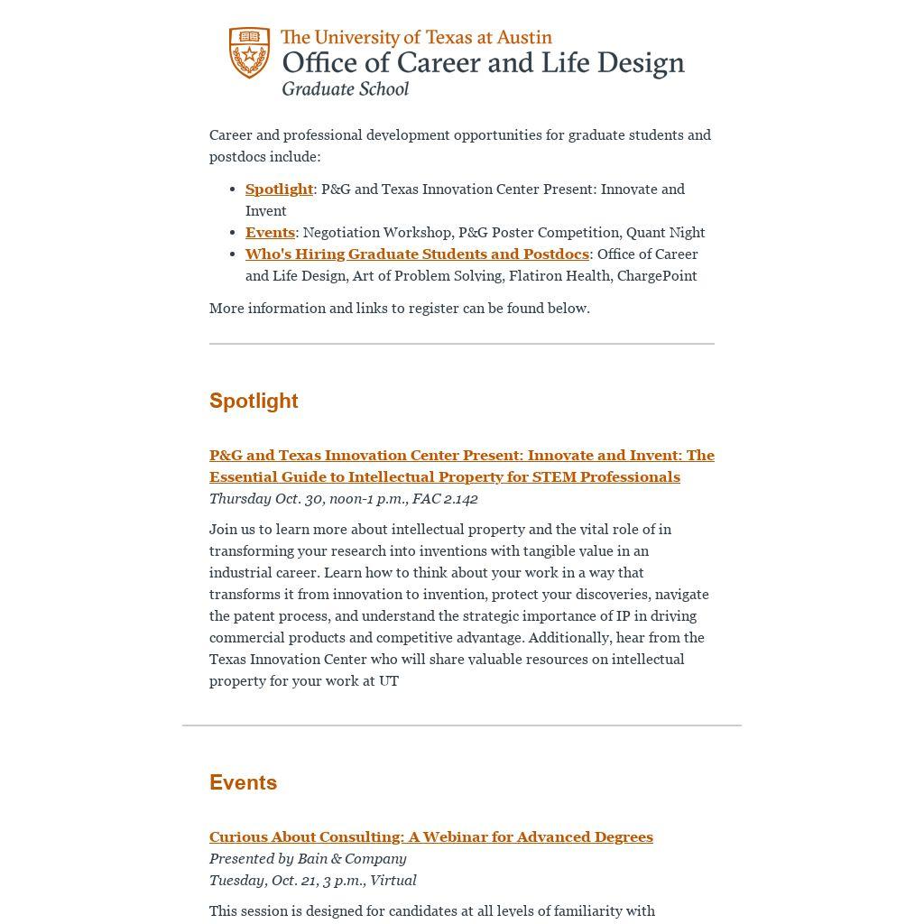 Join us to learn more about intellectual property and the vital role of in transforming your research into inventions with tangible value in an industrial career. Learn how to think about your work in a way that transforms it from innovation to invention, protect your discoveries, navigate the patent process, and understand the strategic importance of IP in driving commercial products and competitive advantage. Additionally, hear from the Texas Innovation Center who will share valuable resources on intellectual property for your work at UT