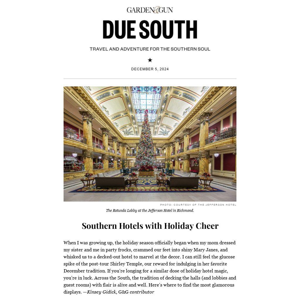 When I was growing up, the holiday season officially began when my mom dressed my sister and me in party frocks, crammed our feet into shiny Mary Janes, and whisked us to a decked-out hotel to marvel at the decor. I can still feel the glucose spike of the post-tour Shirley Temple, our reward for indulging in her favorite December tradition. If you’re longing for a similar dose of holiday hotel magic, you’re in luck. Across the South, the tradition of decking the halls (and lobbies and guest rooms) with flair is alive and well. Here’s where to find the most glamorous displays. —Kinsey Gidick, G&G contributor