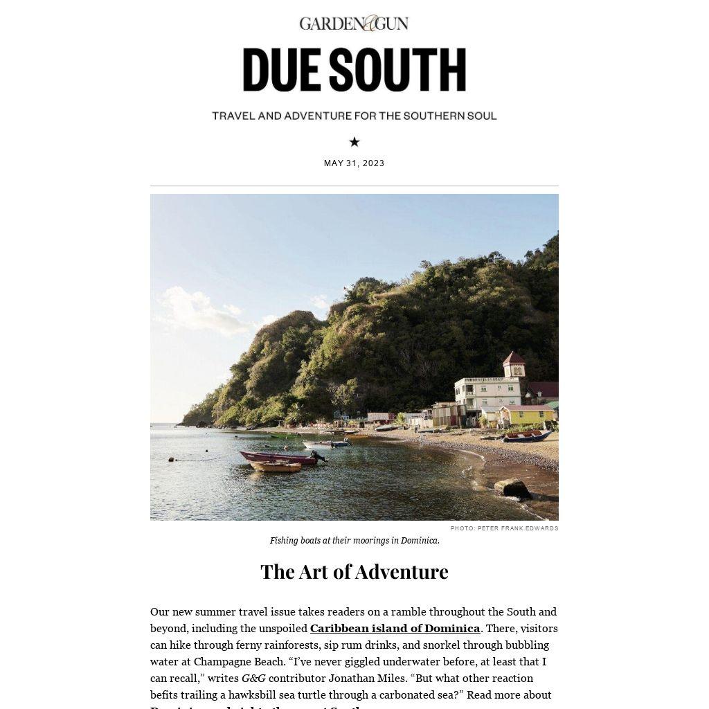 Our new summer travel issue takes readers on a ramble throughout the South and beyond, including the unspoiled Caribbean island of Dominica. There, visitors can hike through ferny rainforests, sip rum drinks, and snorkel through bubbling water at Champagne Beach. “I’ve never giggled underwater before, at least that I can recall,” writes G&G contributor Jonathan Miles. “But what other reaction befits trailing a hawksbill sea turtle through a carbonated sea?” Read more about Dominica and eight other great Southern escapes.