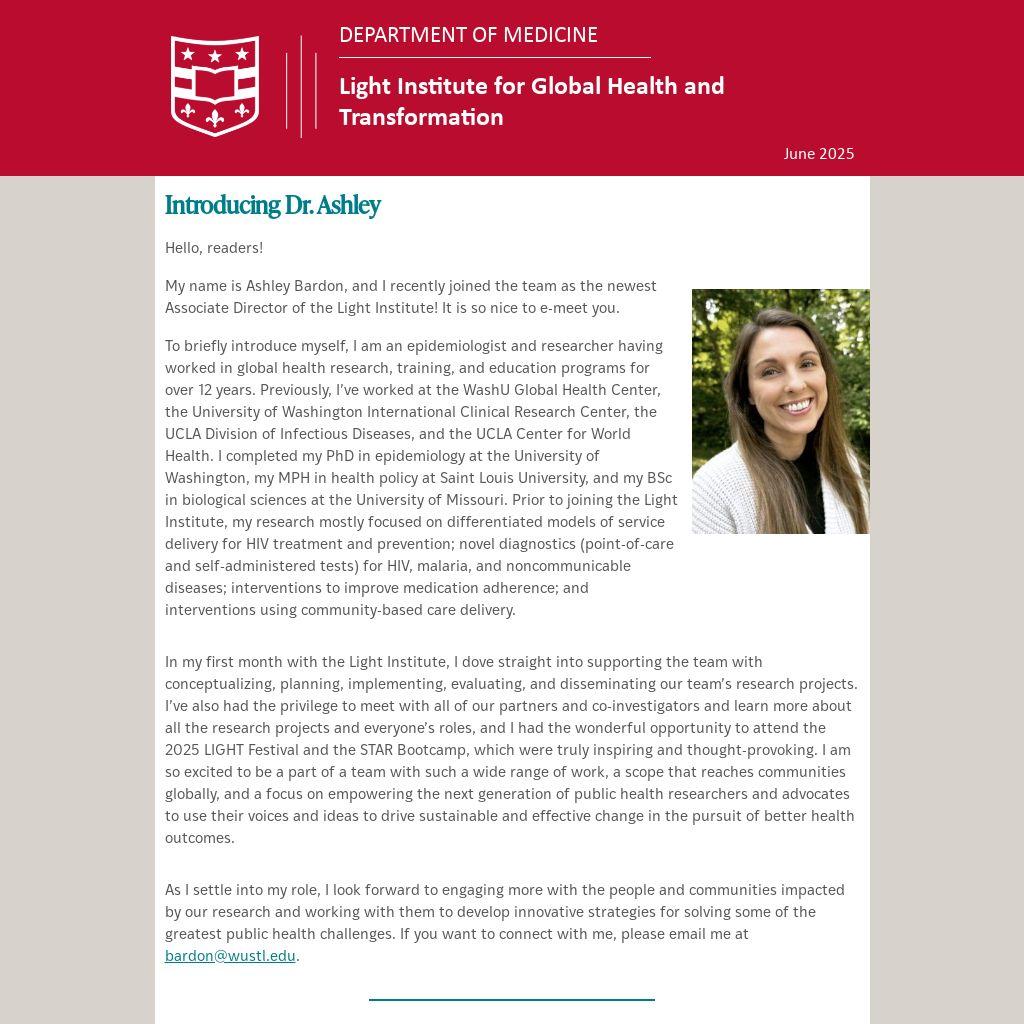 As I settle into my role, I look forward to engaging more with the people and communities impacted by our research and working with them to develop innovative strategies for solving some of the greatest public health challenges. If you want to connect with me, please email me at bardon@wustl.edu.
