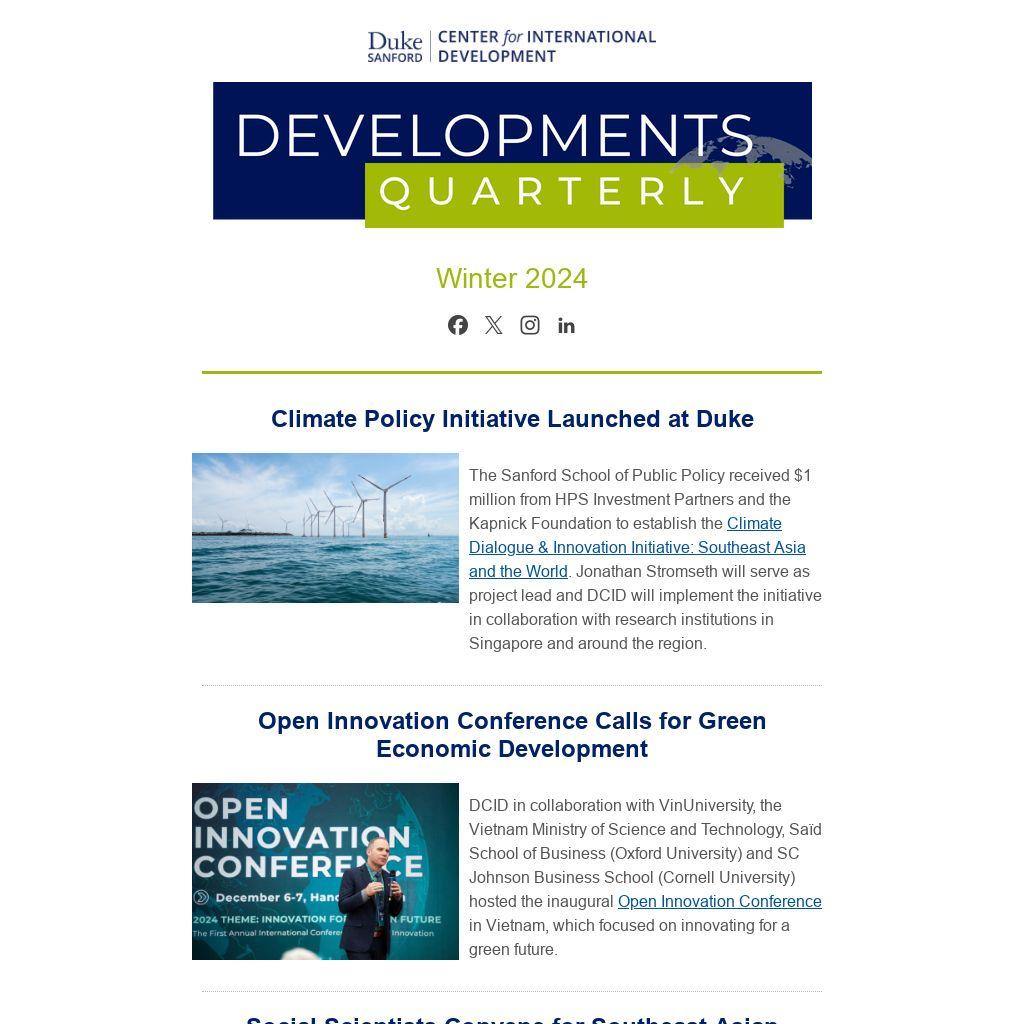 The Sanford School of Public Policy received $1 million from HPS Investment Partners and the Kapnick Foundation to establish the Climate Dialogue & Innovation Initiative: Southeast Asia and the World. Jonathan Stromseth will serve as project lead and DCID will implement the initiative in collaboration with research institutions in Singapore and around the region.