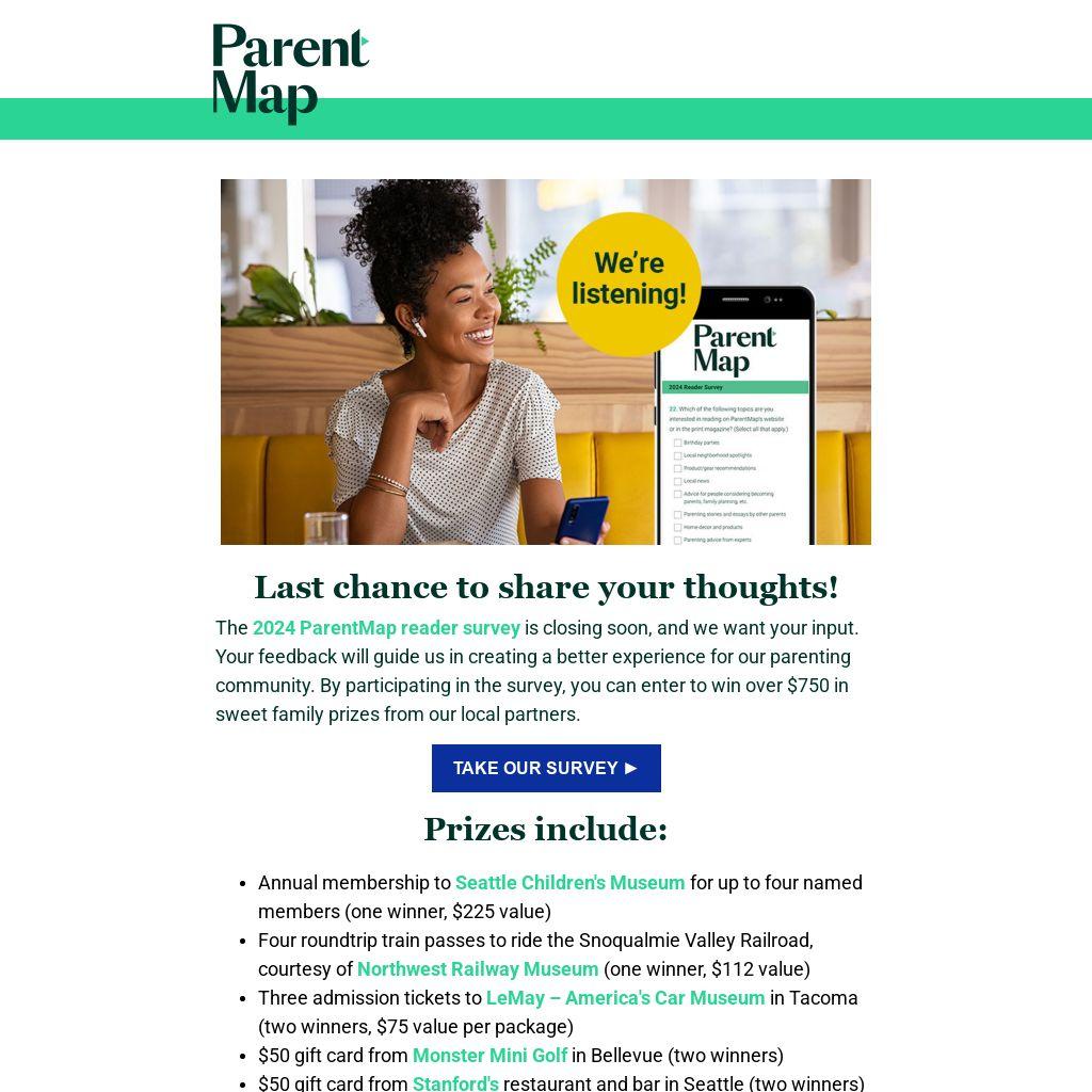 The 2024 ParentMap reader survey is closing soon, and we want your input. Your feedback will guide us in creating a better experience for our parenting community. By participating in the survey, you can enter to win over $750 in sweet family prizes from our local partners.