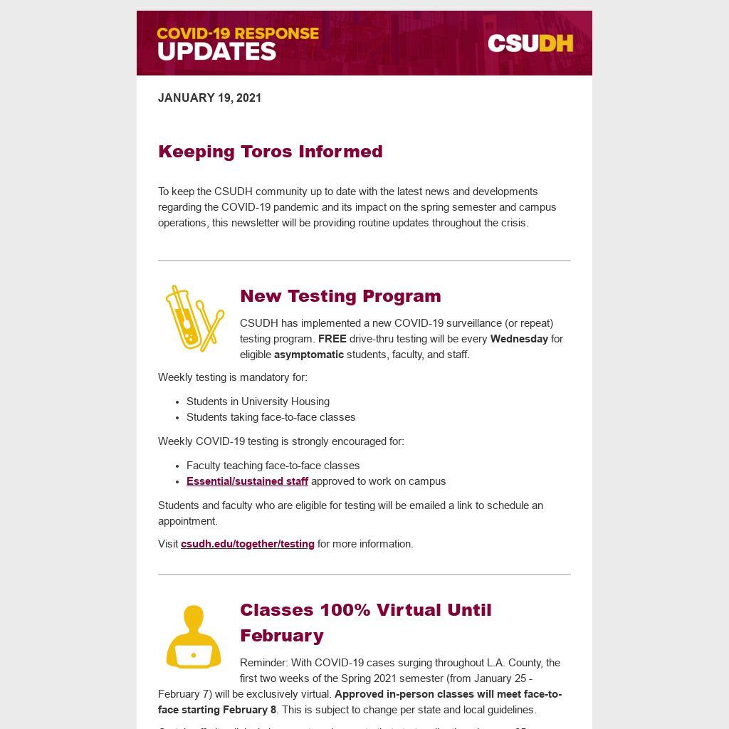 Reminder: With COVID-19 cases surging throughout L.A. County, the first two weeks of the Spring 2021 semester (from January 25 - February 7) will be exclusively virtual. Approved in-person classes will meet face-to-face starting February 8. This is subject to change per state and local guidelines.